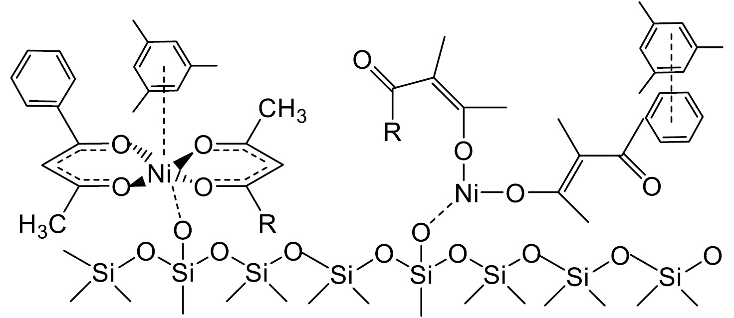 В результате модифицирования Силипора 200 комплексами ацетилацетона, бензоилацетона, ацетоуксусного эфира хелаты могут адсорбироваться на гидроксильных группах его поверхности за счет межмолекулярных взаимодействий, локализованы на стенках пор кремнезема или за счет образования связей Si–O- -Ni (рис. 5).