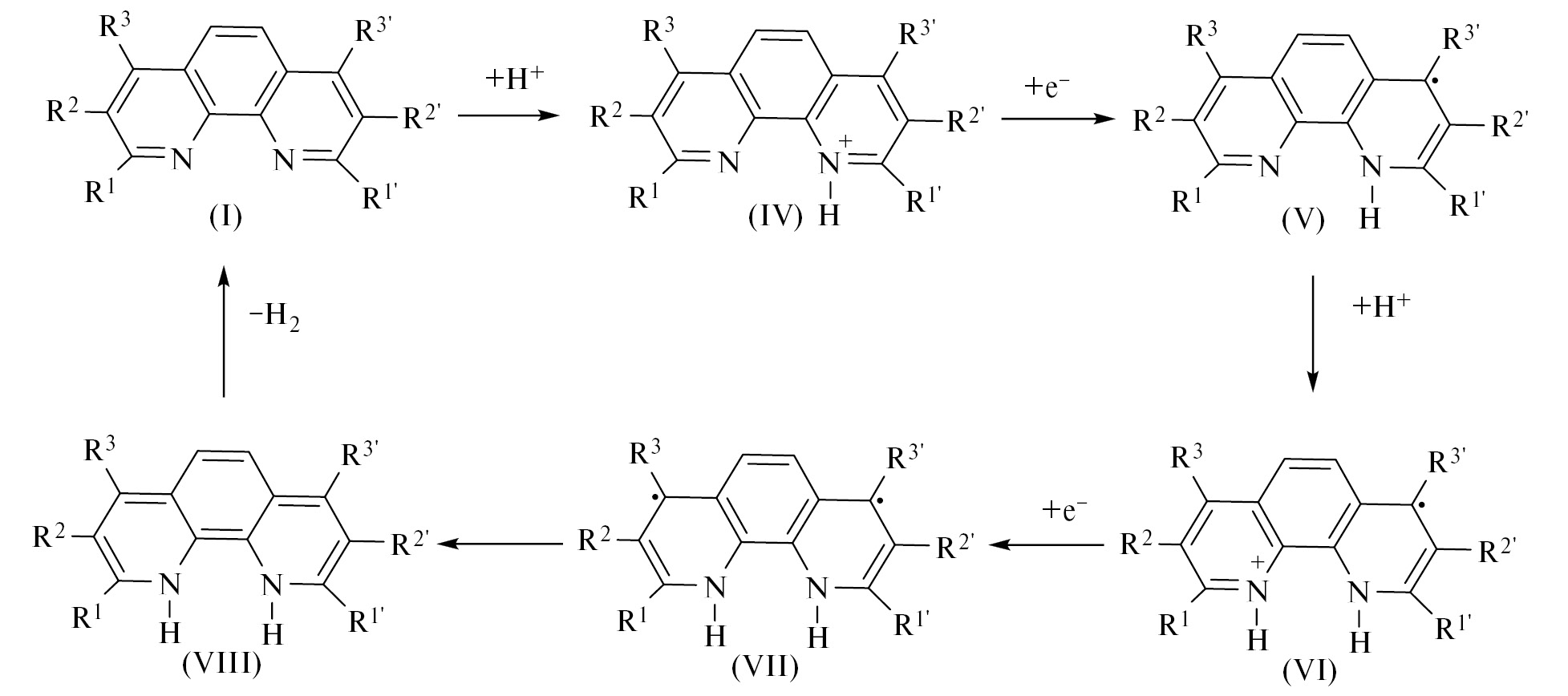 Следующей стадией является восстановление соединения IV с образованием соответствующего радикала (V), далее происходит протонирование второго атома азота с образованием катион-радикала VI с последующим его восстановлением и образованием соединения VII, в котором через стадию внутримолекулярного восстановительного элиминирования отщепляется водород и генерируется стартовое соединение I–III.