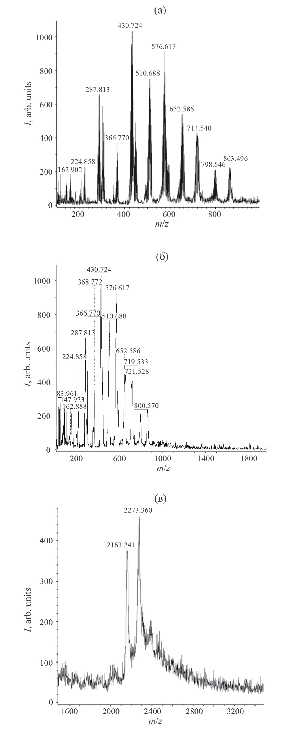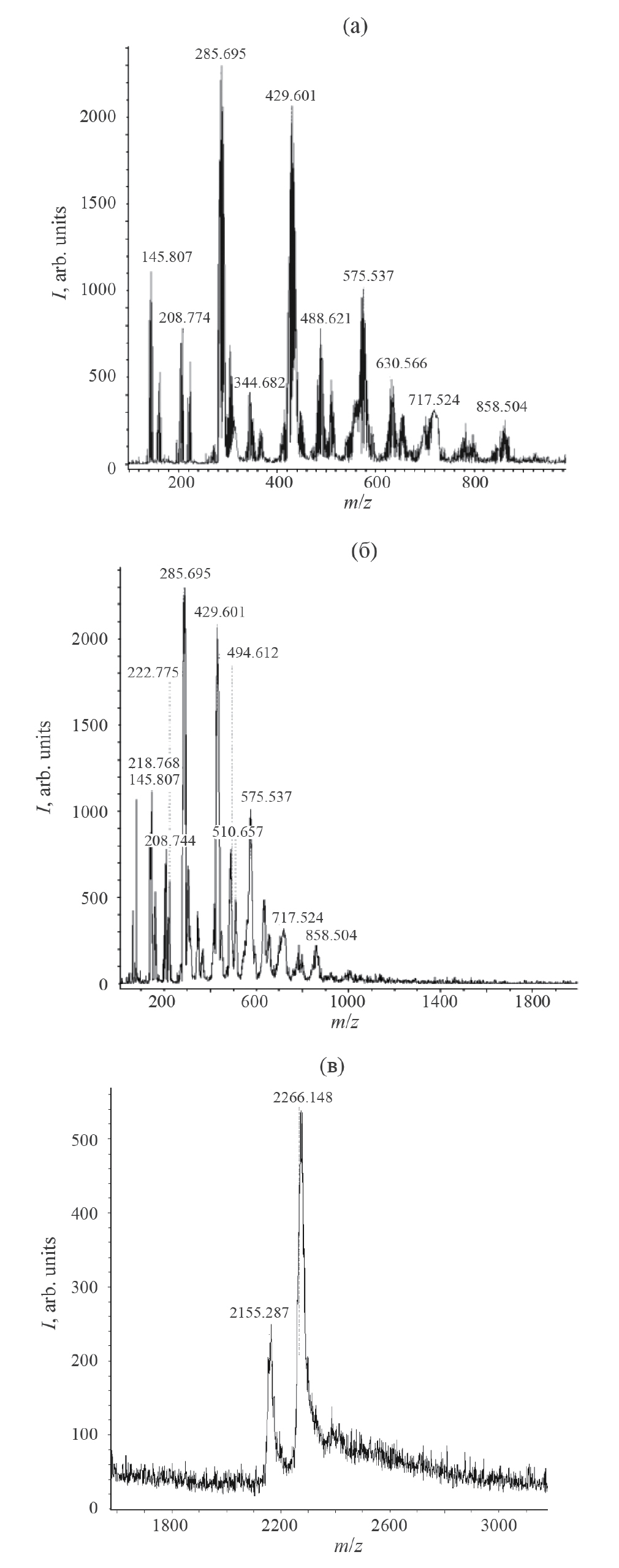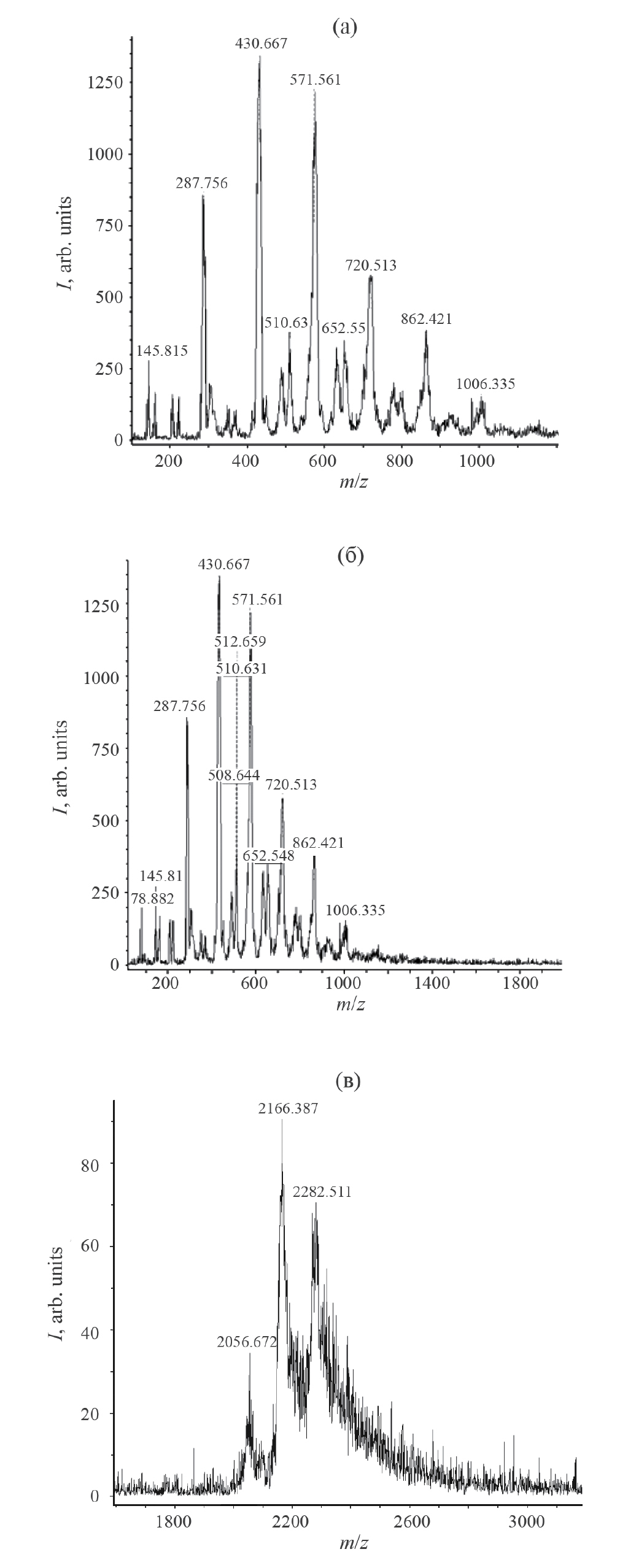 Для получения наиболее информативных масс-спектров использовали режим работы лазера: 40–50 выстрелов с частотой 50 Гц. Энергия лазерного импульса составляла 90–100 мкДж. Исследования проводились в диапазоне масс – до 5000 Да, однако, на приведенных ниже данных представлены только результативные части масс-спектров.