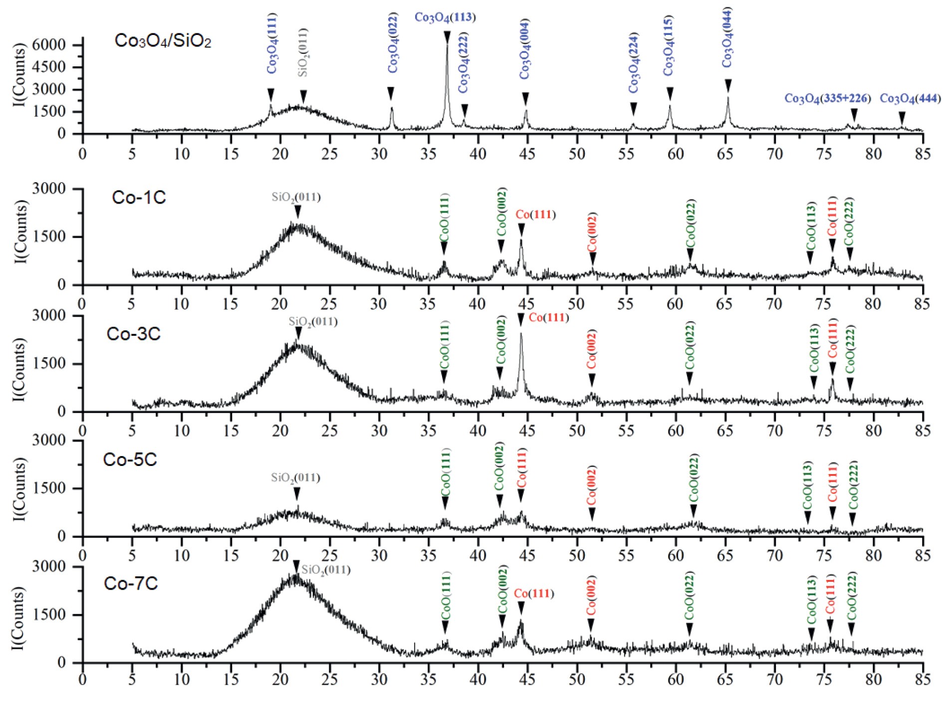 Дифрактограммы образцов представлены на рис. 3. По данным рентгенофазового анализа, в Co3O4/SiO2 единственной кристаллической фазой являются частицы Co3O4 (ICSD98-002-4210). В карбонизированных образцах Co-1C–Co-7C обнаружены частицы металлического кобальта кубической сингонии (ICSD98-062-2435) и оксида CoO (ICSD98-024-5324), а рефлексов, соответствующих смешанному оксиду Co3O4, не обнаружено.