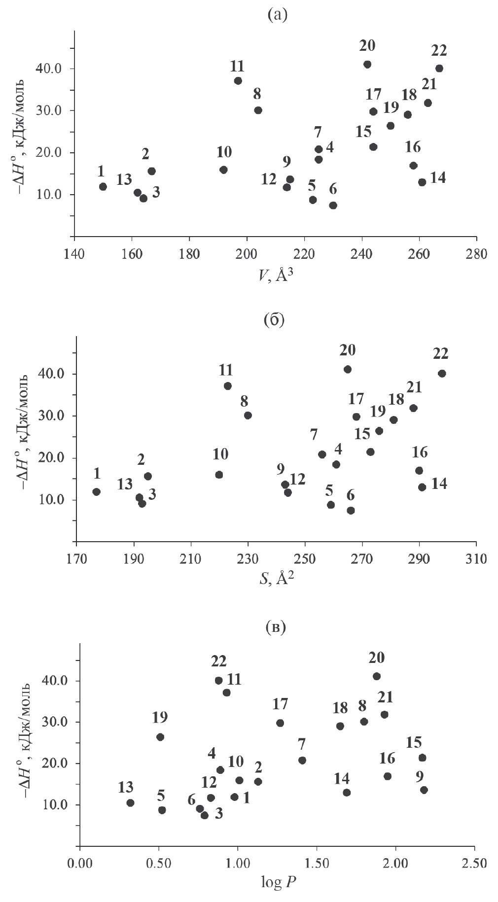 Тем не менее, в целом сорбция исследованных веществ подчиняется закономерностям обращенно-фазовой высокоэффективной жидкостной хроматографии (ОФ ВЭЖХ), в соответствии с которыми удерживание определяется, главным образом, дисперсионными взаимодействиями молекул сорбатов с поверхностью сорбента, увеличиваясь, таким образом, с возрастанием размерных параметров и гидрофобности молекул (характер изменения данных параметров в зависимости от строения молекул производных хинолина проанализирован нами ранее [16]). Для исследованных сорбатов, как следует из рис. 1, наблюдается симбатность в изменении энтальпии сорбции |ΔH°| с изменением значений ван-дер-ваальсового объема, площади поверхности и гидрофобности молекул. (Все приведенные выше данные представлены для концентрации ацетонитрила в элюенте, равной 50%). Отсутствие при этом строгой линейной корреляции и большой разброс соответствующих значений обусловлены, вероятно, влиянием полярного элюента. Различиями в характере процессов, протекающих в хроматографической колонке с изменением состава элюента, можно, вероятно, объяснить неоднозначное изменение абсолютного значения энтальпии сорбции |ΔH°| и энтропийного члена в выбранном интервале концентрации ацетонитрила для соединений разного строения. Так, для веществ 1, 2, 8 и 17–22 значения |ΔH°| закономерно уменьшаются с увеличением содержания ацетонитрила в элюенте, в то время как для веществ 3–7 значения |ΔH°| сначала уменьшаются, затем возрастают, а для веществ 9–16, напротив, сначала возрастают, а затем уменьшаются.