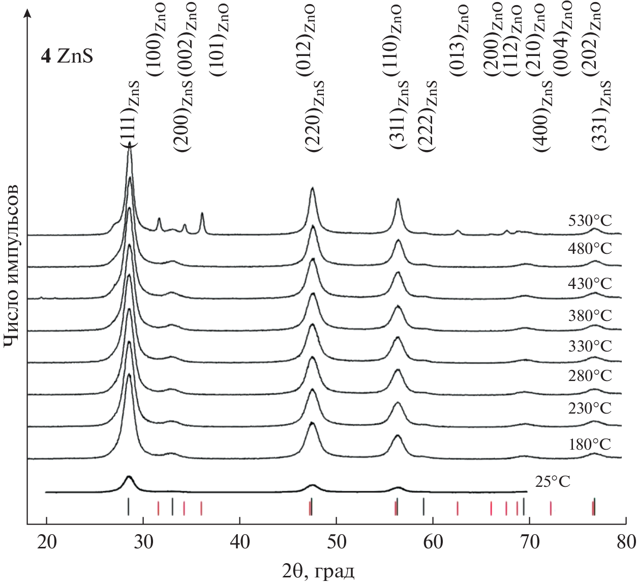 Nanocrystalline zinc sulfide (ZnS) powders are prepared via hydrothermal deposition from aqueous solutions of zinc nitrate and sodium sulfide in the presence of sodium citrate or Trilon B. The average particle sizes of the product ZnS nanopowders ranging from 2 to 9 nm are tuned via varying the batch concentrations of the reagents. Air-annealing of as-prepared ZnS nanopowders at temperatures of 280 to 530°C oxidizes cubic zinc sulfide to hexagonal zinc oxide. The oxidation of the finest-grained zinc sulfide nanopowders having a particle size of 2 nm starts at 280–330°C, while the coarsest-grained nanopowder having a particle size of 9 nm starts to oxidize at 530°C. In the coarsest-grained ZnS powder, the particle size increases as little as from 9 to 12 nm when temperature rises to 530°C, while the finest-grained nanopowders have their particle sizes increase from 2 to 9 nm in response to the same rise in temperature.