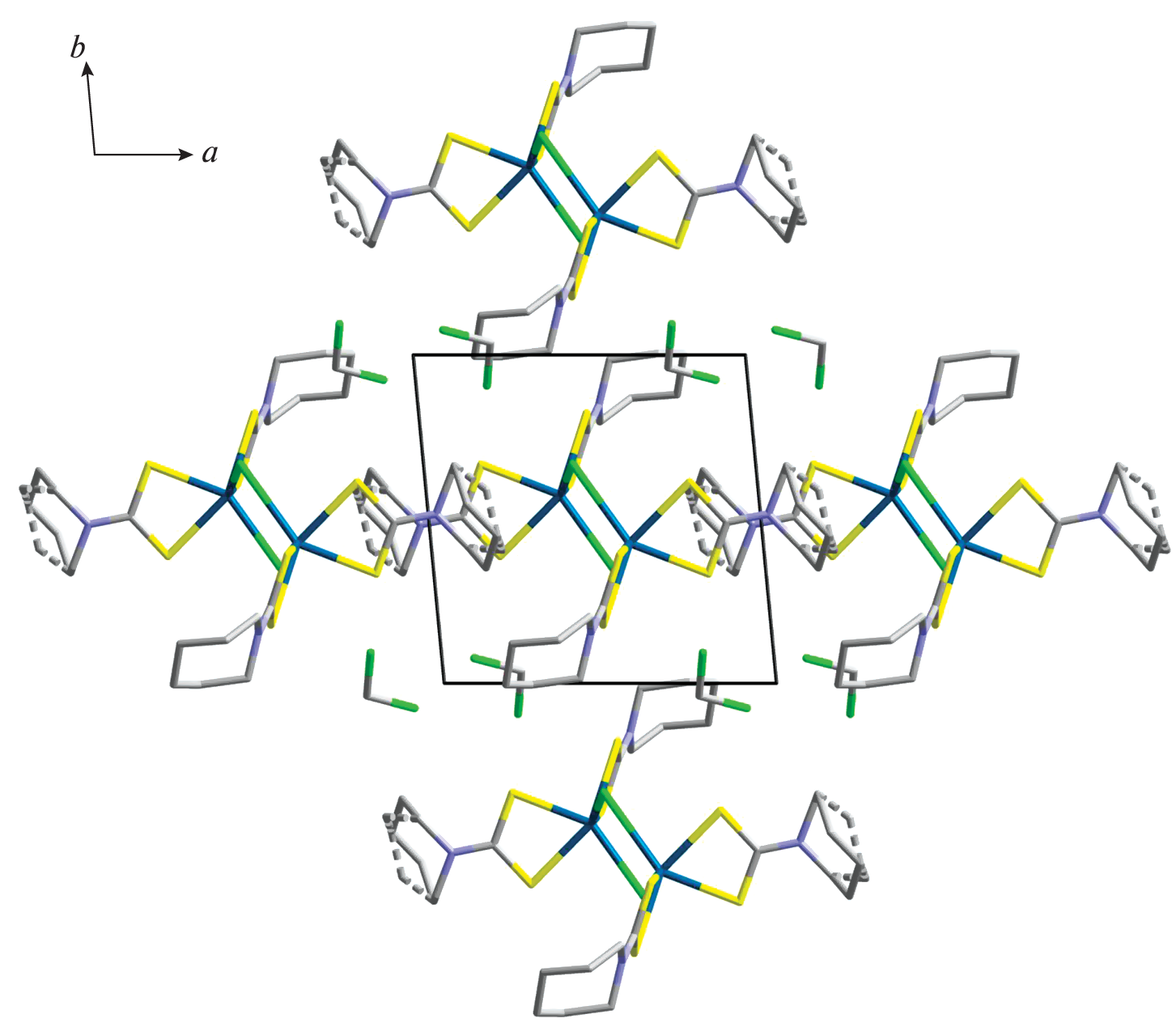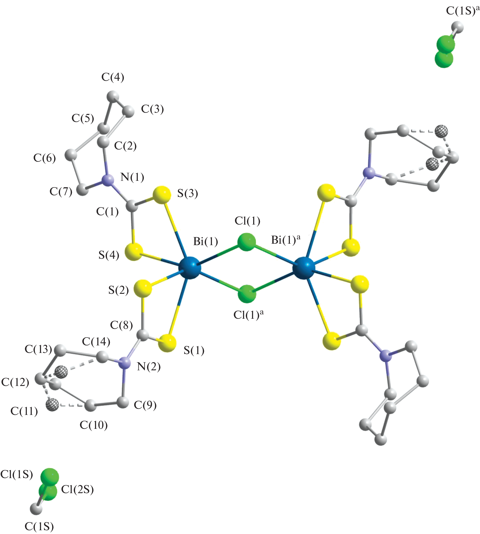 Heteroleptic compounds of bismuth(III) adopting a new binuclear structural type: hexamethylenedithiocarbamato(HmDtc)-chloride of [Bi2(S2CNHm)4(μ2-Cl)2] (I) and its solvated form [Bi2(S2CNHm)4(μ2-Cl)2]·2CH2Cl2 (II) have been isolated and studied by X-ray diffraction, IR spectroscopy, and simultaneous thermal analysis. Despite the identical chemical composition, the structure of binuclear molecules in I and II differs significantly. In the first case, the noncentrosymmetric molecule includes two nonequivalent moieties of [Bi(S2CNHm)2Cl], which are combined by μ2-Cl ligands to form the [Bi–(μ2-Cl)2–Bi] metallocycle in the butterfly conformation: Bi(1)–Bi(2) 4.0785(5) Å, Cl(1)–Cl(2) 3.936(2) Å. On the contrary, in the solvated form II, the complex is centrosymmetric and four-membered [Bi2Cl2] ring is stabilized in a rhombic configuration: Bi(1)–Bi(1)a 3.9592(9) Å and Cl(1)–Cl(1)a 4.540(4) Å. According to the microprobe method, the main residual substance after the thermolysis of the complexes is microcrystalline Bi2S3 with inclusions of metallic bismuth particles.