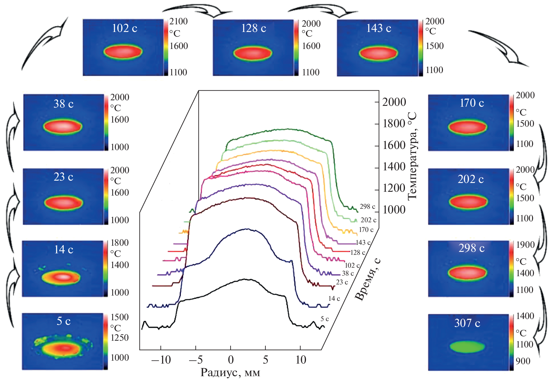 Изучено поведение керамического материала Ta4HfC5–30 об. % SiC под воздействием сверхзвукового потока диссоциированного азота, что необходимо для оценки перспектив применения подобных материалов в бескислородных газовых средах при температурах >1800°C. Установлено, что в результате нагрева поверхности до ~2020°C через несколько минут наблюдается уменьшение температуры до ~1915°C с последующим медленным снижением до 1881°С. Вероятно, это связано с протекающими на поверхности химическими процессами и формированием чрезвычайно шероховатой микроструктуры. Определена скорость уноса, показано, что ни при вводе образца в высокоэнтальпийную струю азота, ни при резком охлаждении (падение температуры на ~880°С за 9–10 с) не наблюдается растрескивания образца или отслоения приповерхностной области. Данные РФА и Раман-спектроскопии позволяют говорить о полном удалении из поверхностного слоя карбида кремния и преобразовании сложного карбида тантала-гафния в соответствующий нитрид.