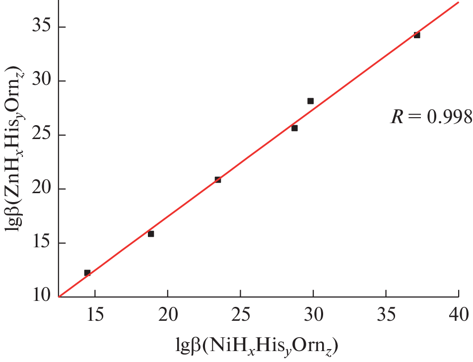 The formation of mixed-ligand complexes of various compositions in the Zn–L-histidine (His)–L-ornithine (Orn) system has been studied by pH-metry, calorimetry, and NMR spectroscopy. The thermodynamic parameters (log K, ΔrG0 ΔrH, ΔrS) of the reactions of their formation at 298.15 K and ionic strength I = 0.5 (KNO3) have been calculated. Based on the comparative analysis of thermodynamic parameters, the most probable method for the coordination of amino acid residues in mixed complexes has been proposed.