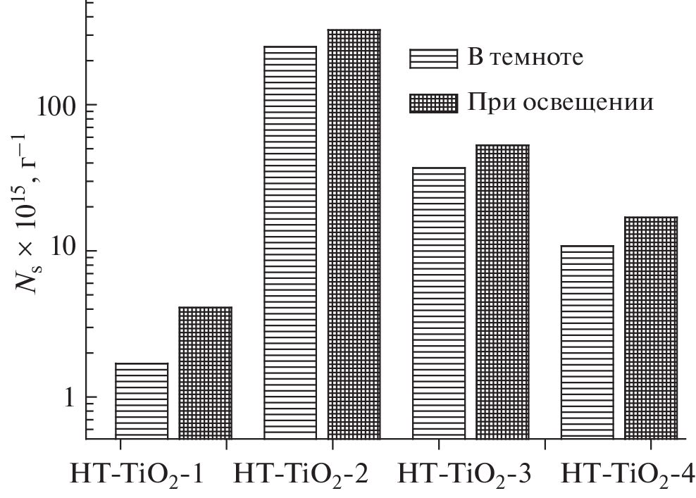 Arrays of titanium dioxide (TiO2) nanotubes with different chemical compositions have been synthesized; their structural properties have been studied, and the characteristics of spin centers (defects) have been determined. All samples have appeared to contain carbon. It has been established that the main type of spin centers in TiO2 nanotubes are dangling carbon bonds, and their concentration correlates with the carbon content in the obtained structures. Under illumination, a reversible increase in the concentration of defects occurs, which is caused by their photoinduced recharging in the process of impurity absorption. This process is accompanied by an increase in the concentration of photoexcited electrons in the conduction band. The originality and novelty of the work are determined by the development of a method for controlling the density of defects and, accordingly, the concentration of photoinduced electrons by thermal treatment of samples under various conditions. The results open up new possibilities for the development of photocatalysts based on titanium dioxide nanotubes with a controlled electron concentration in the conduction band that function in the visible range of the spectrum.
