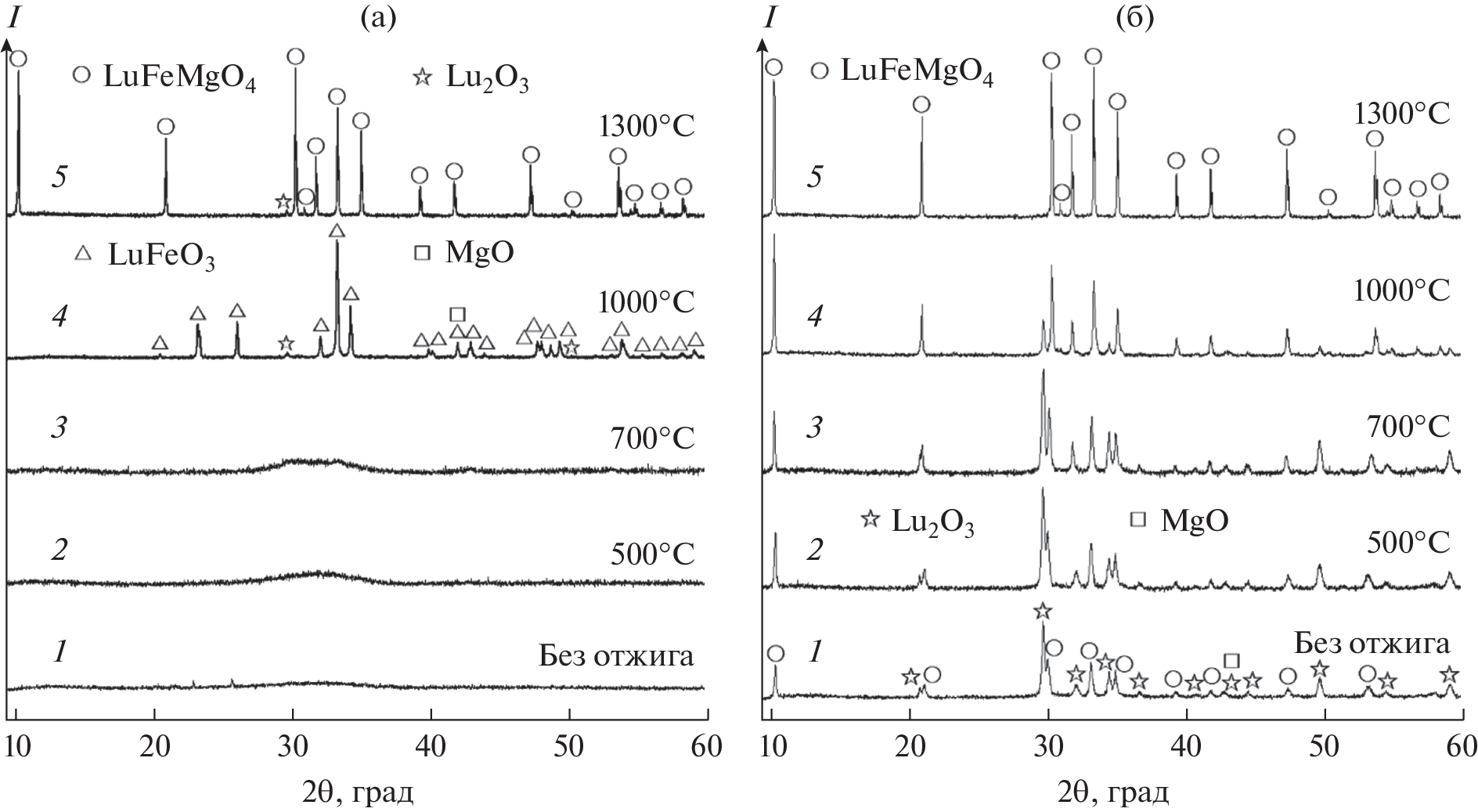 A new method for the production of LuFeMgO4 based on the combustion reaction of a gel-like precursor prepared from metal nitrates and fossil fuels has been proposed. The possibility to prepare this oxide from stoichiometric compositions of metal nitrates with polyvinyl alcohol (PVA) and glycine has been studied. The adiabatic combustion temperatures Tad have been estimated for the systems under consideration. The combustion products of PVA-nitrate and glycine-nitrate compositions before and after their heat treatment have been studied using X-ray diffraction analysis and IR spectroscopy. It has been established that the combustion reaction products of the PVA-nitrate composition are an X-ray amorphous powder, while those of the glycine-nitrate composition are a mixture of nanocrystalline oxides containing 52.5 wt % LuFeMgO4. According to X-ray diffraction and SEM data, 4-h annealing of this mixture at 1300°C leads to the formation of a single-phase LuFeMgO4 powder with a layered microstructure and a grain size of about 1–2 μm.