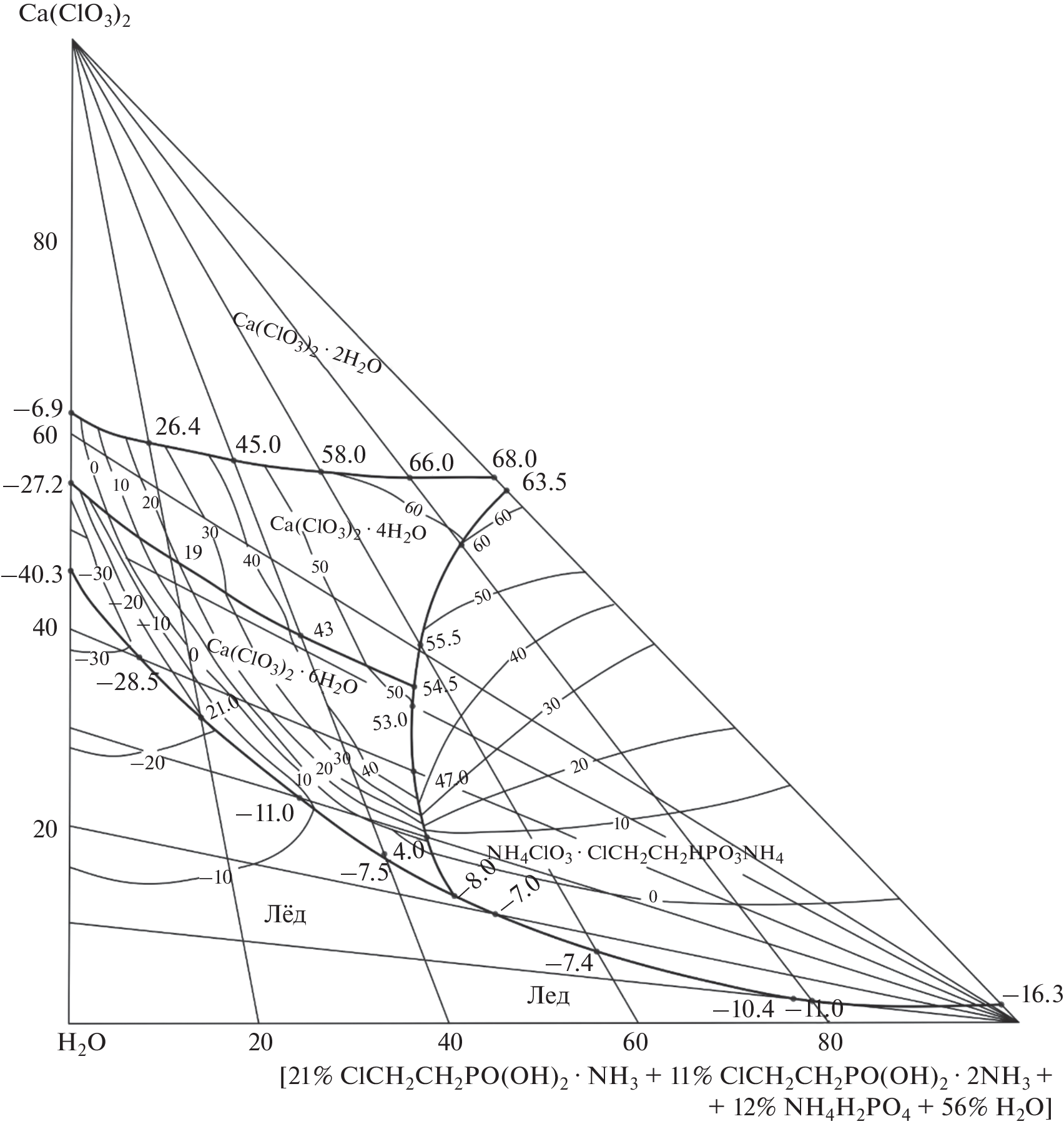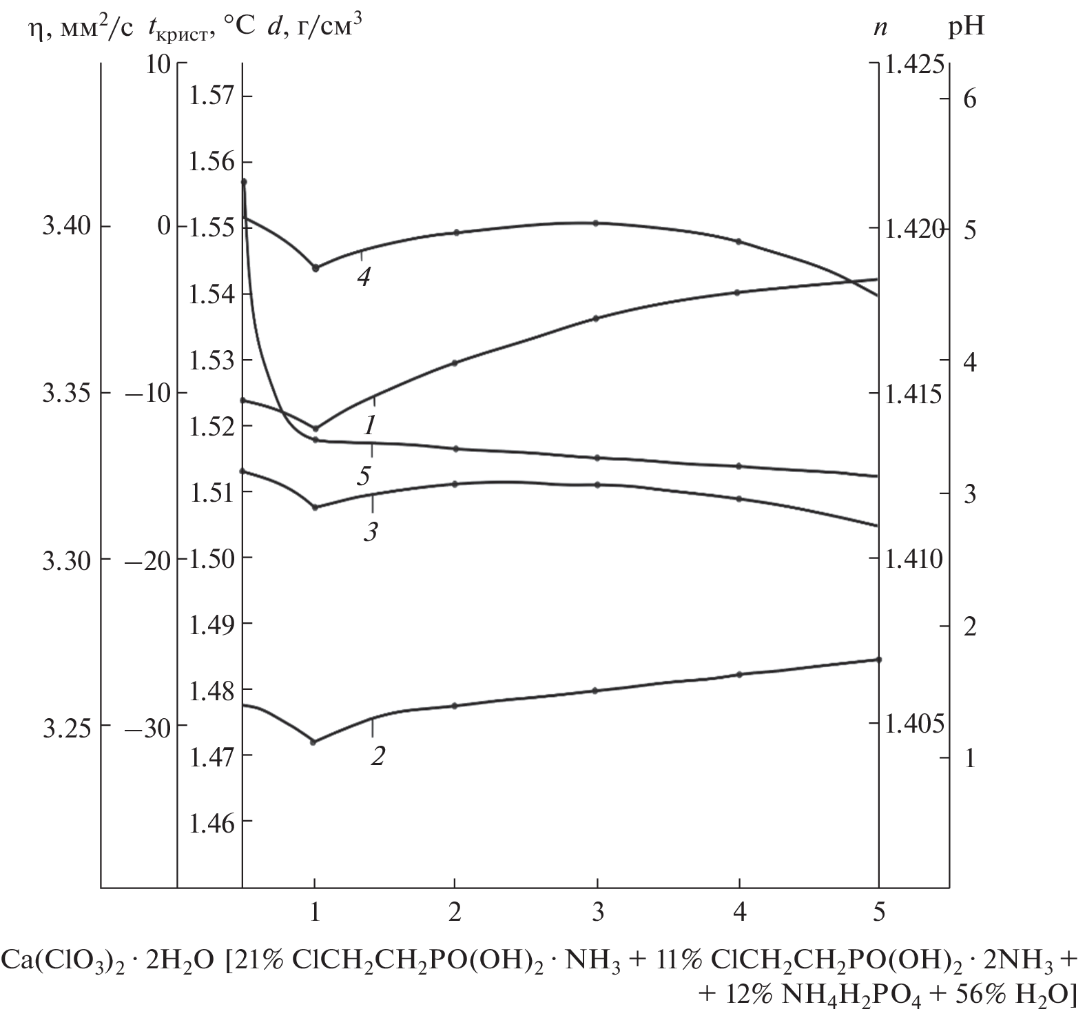 Mutual effect of components in complex aqueous system comprising calcium chlorate, ammonium dihydrogen phosphate, and ammonium chloroethylphosphonates has been studied. Polythermal diagram of system solubility has been built in the temperature range from –40.3 to 68.0°C. Phase diagram of system solubility demarcates crystallization fields for ice, calcium chlorate hexa-, tetra-, and dihydrate, and compound of composition NH4ClO3·ClCH2CH2HPO3NH4. The compound has been isolated from supposed crystallization field and has been identified by chemical and physicochemical analysis. To provide foundation for the process of preparation of efficient stimulant and mild defoliant based on calcium chlorate and Nazhot preparation, rheological properties of components in the system Ca(ClO3)2–[21% ClCH2CH2PO(OH)2⋅NH3 + 11% ClCH2CH2PO(OH)2⋅2NH3 + 12% NH4H2PO4 + 56% H2O]–H2O have been studied. Composition–property diagram has been built for the system.