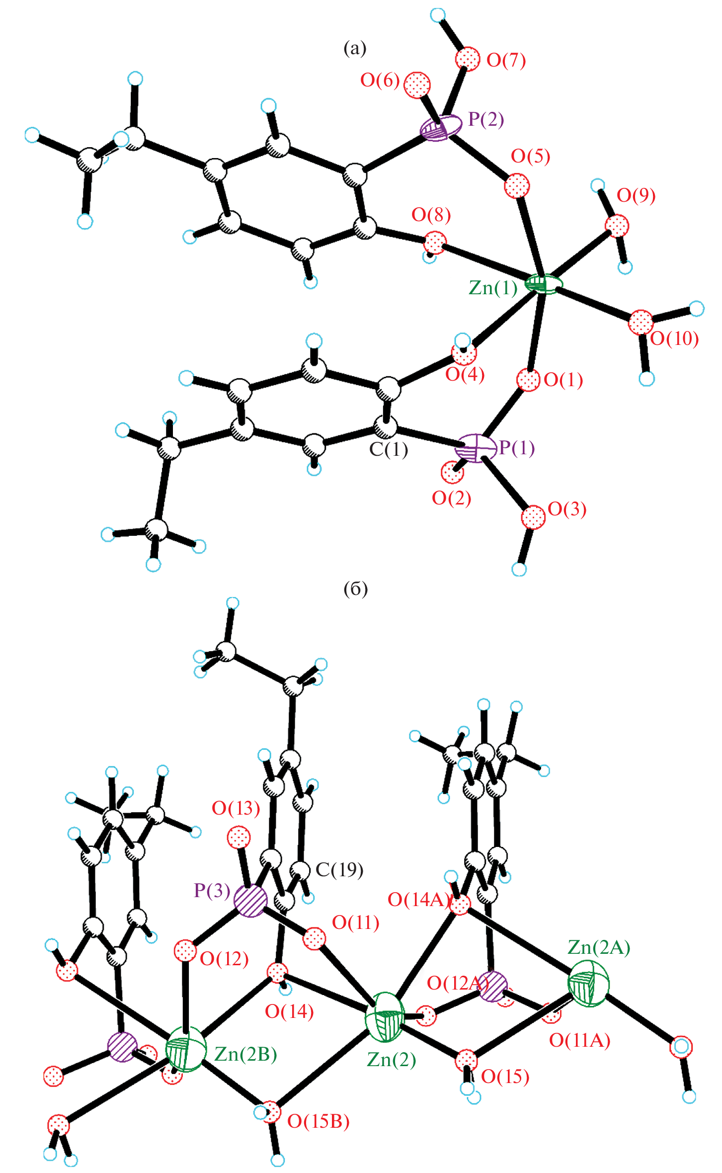 A complex of zinc(II) with 2-hydroxy-5-ethylphenylphosphonic acid (H3L) of the composition [Zn(H2L)2(Н2О)2][Zn(HL)(Н2О)]·H2O (I) was synthesized, the structure of which was established based on data of X-ray diffraction and elemental analysis, quantum chemical calculations, as well as IR and electron absorption spectroscopies. The stability constants of H3L acid complexes with zinc(II) perchlorate in water were determined by potentiometric titration. The cytotoxic properties of H3L acid and complex I were studied for the first time on HeLa cells (human cervical adenocarcinoma). The results on the accumulation of complex I in HeLa cells were obtained by laser confocal microscopy.
