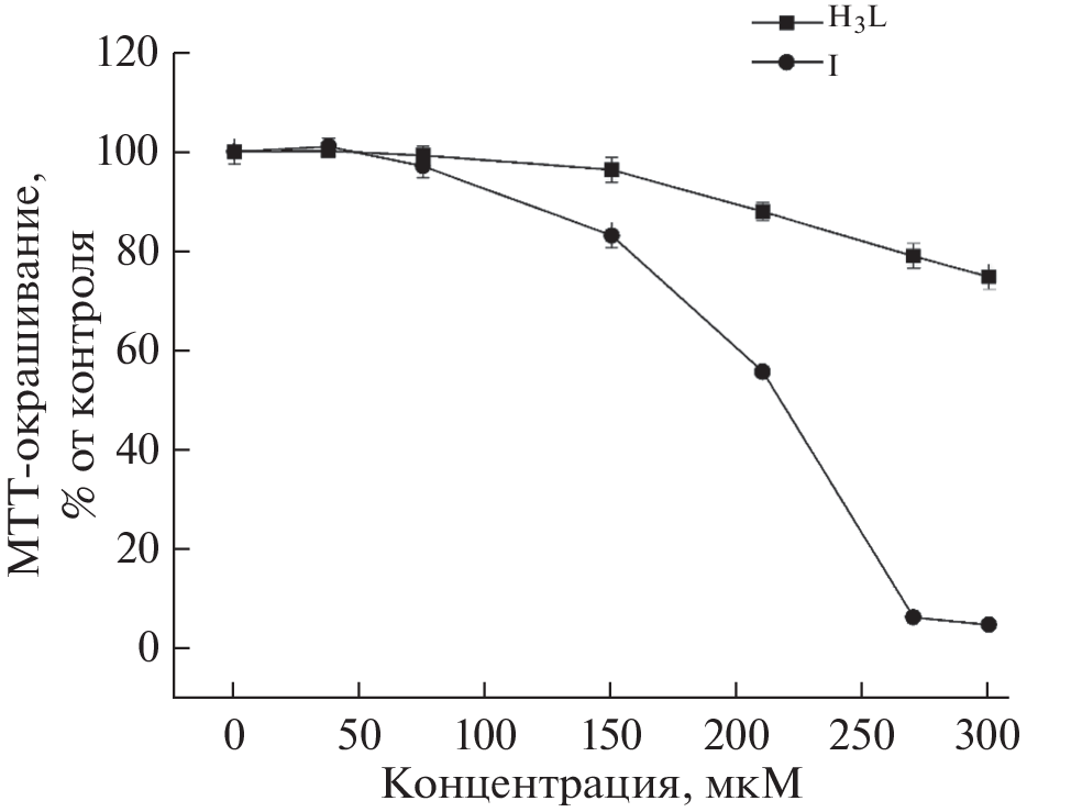 Синтезирован комплекс цинка(II) с 2-окси-5-этилфенилфосфоновой кислотой (Н3L) состава [Zn(H2L)2(Н2О)2][Zn(HL)(Н2О)] · H2O (I), структура которого установлена на основании совокупности данных рентгеноструктурного и элементного анализа, квантово-химических расчетов, ИК- и электронной спектроскопии. Потенциометрическим титрованием определены константы устойчивости комплексов кислоты Н3L с перхлоратом цинка(II) в воде. Впервые изучены цитотоксические свойства кислоты Н3L и комплекса I на клетках HeLa (аденокарцинома шейки матки человека). Методом лазерной конфокальной микроскопии получены результаты по накоплению комплекса I в клетках HeLa.