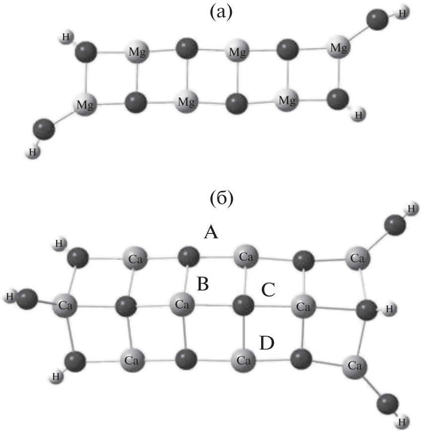 The optimal geometries of (CaO)n and (MgO)n clusters at n = 2–30 have been found and the enthalpies of formation of 1D, 2D, and 3D structures have been determined using quantum-chemical DFT calculations. The calculation demonstrates that the formation of linear chains of Ca and Mg oxides practically does not occur, while the formation of two-dimensional (tiled) and three-dimensional (cubic) structures proceeds with a large release of energy. The competing process of formation of molecular rods consisting of planar six-membered rings (MO)3 has been considered, and it has been shown to proceed not through the stage of preliminary formation of six-membered rings, but directly from monomer units.