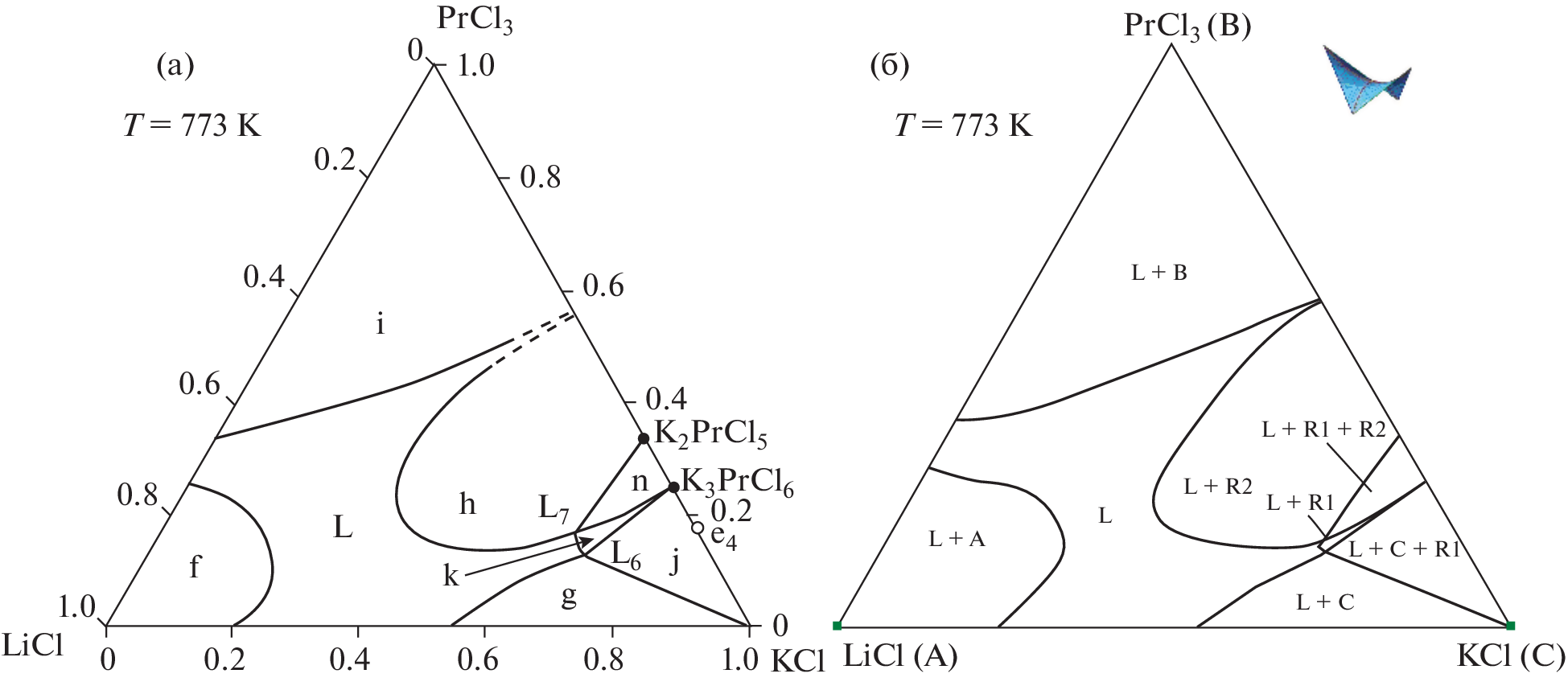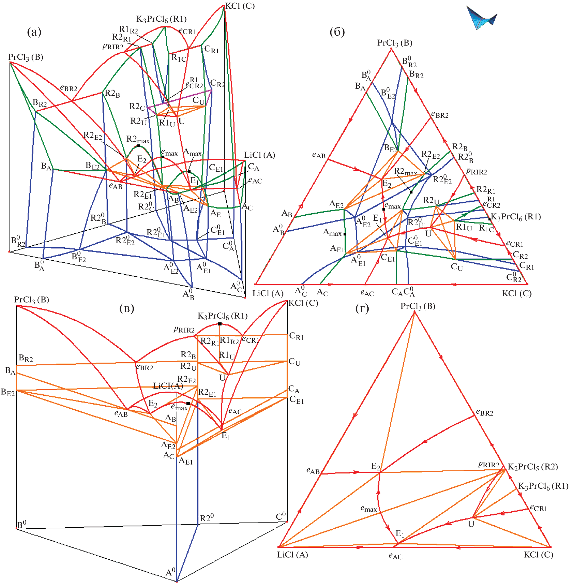 A spatial (3D) computer model of an isobaric phase diagram of the LiCl–PrCl3–KCl system was designed. The model was assembled of 66 surfaces and 27 phase regions, of which 31 surfaces and 14 phase regions degenerate to verticals or vertical planes because of the limited solubilities of the initial chlorides and their compounds. Published experimental isothermal sections and thermoanalytical curves for 33 salt melts were used to improve the quality of the 3D model. The results can be used to improve the molten-salt refining technology of nuclear fuel waste.