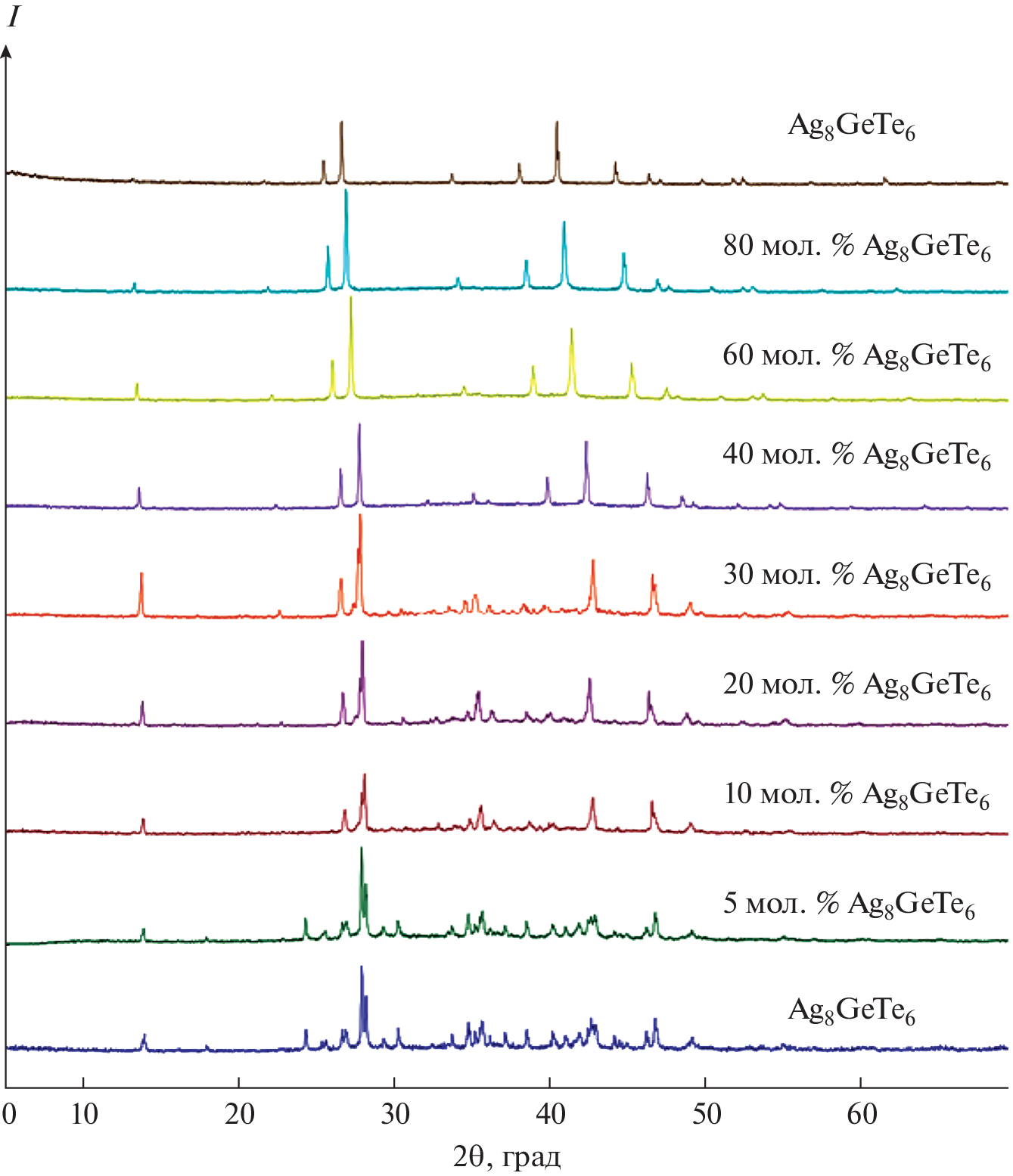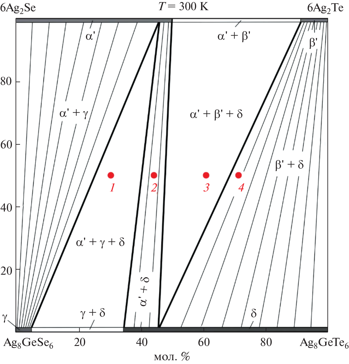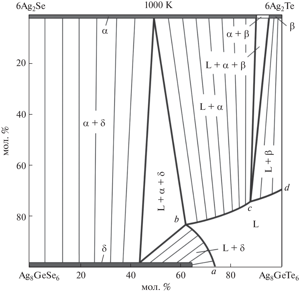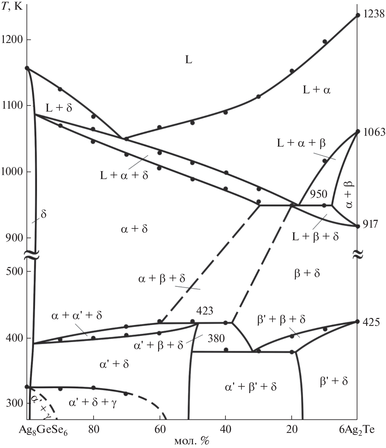 Here, we present the results of DTA and XRD studies of phase equilibria in the 6Ag2Se + Ag8GeTe6 ↔ 6Ag2Te + Ag8GeSe6 reciprocal system (system A). A Т–х diagram of the Ag8GeSe6–Ag8GeTe6 boundary system, several inner polythermal sections, isothermal sections at 300 and 1000 K, and the liquidus surface projection were plotted. The Ag8GeSe6–Ag8GeTe6 system is a partially quasi-binary system; it features continuous substitutional solid solutions between Ag8GeTe6 and the high-temperature cubic Ag8GeSe6 phase (the δ phase). Once solid solutions are formed, the polymorphic transition temperature in Ag8GeSe6 decreases, thereby stabilizing the ion-conducting cubic phase in the range of ≥40 mol % Ag8GeTe6 compositions at room temperature and below it. System A is shown to be a reversible reciprocal system; its liquidus surface is comprised of three fields, which relate to the primary crystallization of the solid solutions between the high-temperature Ag2Se and Ag2Te (α phase) phases, IT-Ag2Te-base solid solutions (β phase), and the δ phase. The subsolidus portion of system A features complex interactions related to polymorphism in the terminal compounds and in phases based on them