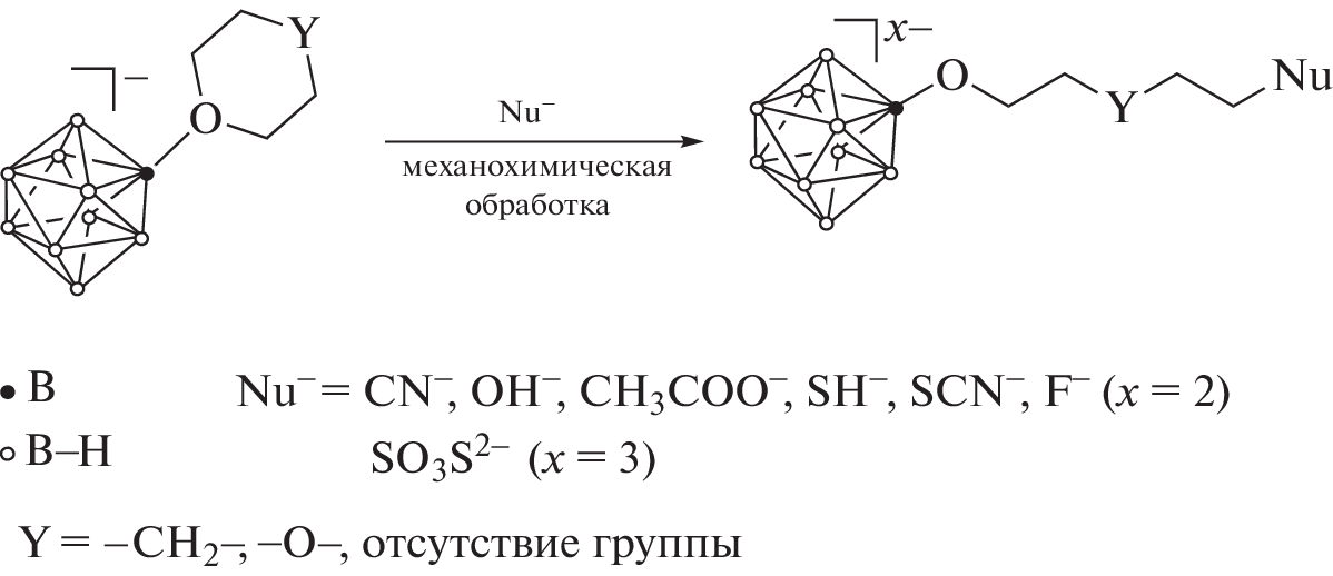 A new method for the preparation of derivatives of the closo-decaborate anion with pendant functional groups has been developed, which includes the reaction of 1,4-dioxane, tetrahydropyran, and tetrahydrofuran derivatives of the [B10H10]2– anion with C-, O-, S-, and F-nucleophilic reagents (potassium cyanide, potassium hydroxide, sodium acetate, potassium hydrosulfide, potassium thiocyanate, sodium thiosulfate, and potassium fluoride) under mechanochemical conditions. It has been shown that these reactions proceed through the opening of exopolyhedral substituents of the oxonium type and lead to the formation of closo-decaborates with the corresponding С-, O-, S-, and Hal-functional groups. The developed method makes it possible to synthesize derivatives of the [B10H10]2– anion with pendant groups of various structures in a short time and without using aprotic polar solvents, which greatly facilitates the process of product isolation. The resulting closo-decaborates due to the presence of donor centers of various types can be used as polydentate ligands to obtain complex compounds of d-elements. In addition, the synthesized compounds can be used as a platform for further functionalization due to the reactivity of the attached pendant groups. The obtained derivatives of the [B10H10]2– anion have been studied by elemental analysis, IR, 11B, 13C, 1H NMR spectroscopy, and ESI mass spectrometry. The structure of Cs2[B10H9O(CH2)2O(CH2)2SCN] compound has been determined using X-ray diffraction.