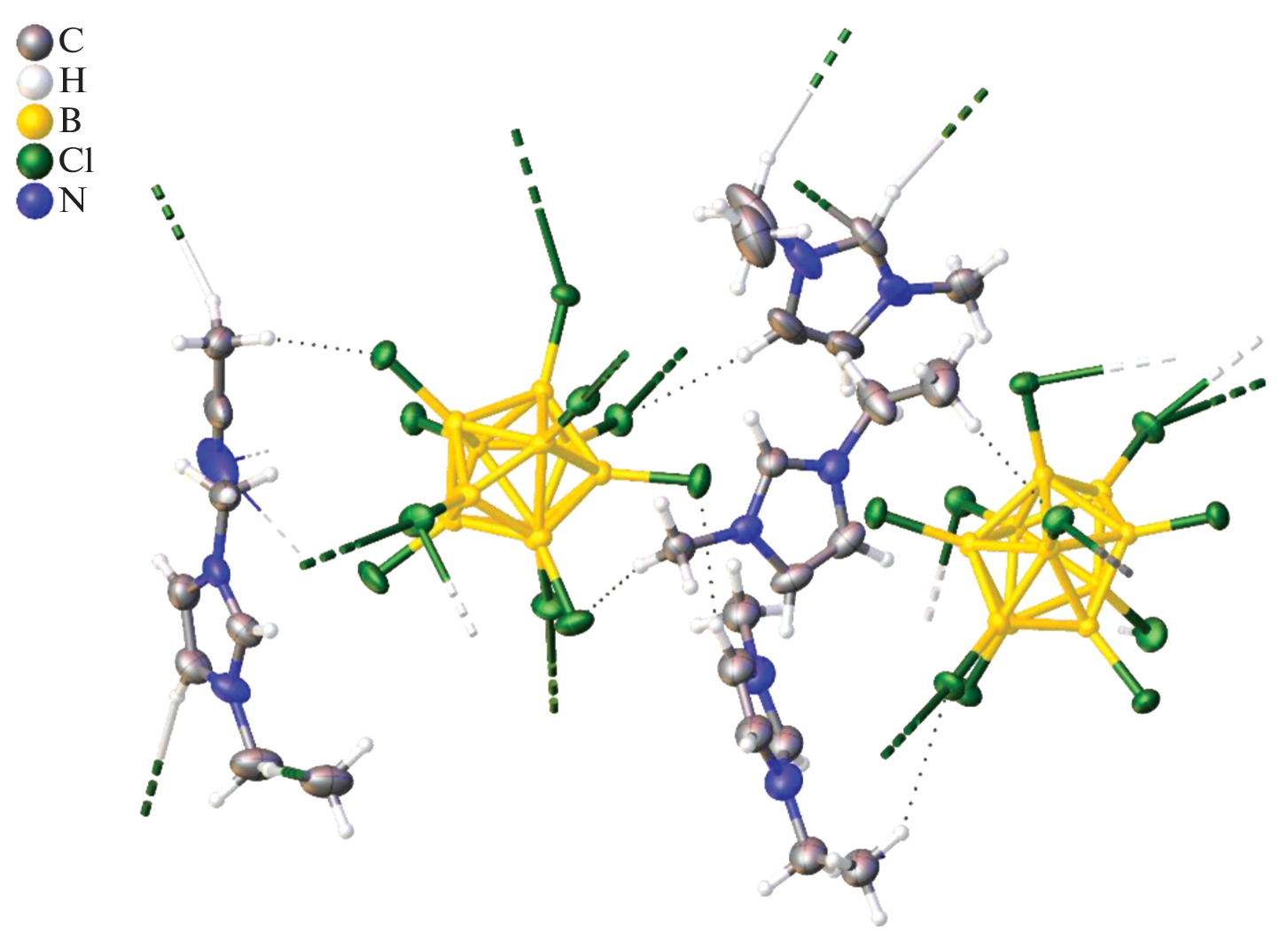 A new method for the synthesis of imidazolium salts of the perchlorinated closo-decaborate anion (RMIM)2[B10Cl10] (R = H, n-Et, n-Bu, n-C8H17) has been proposed. The synthesis of these compounds can be carried out by simple metathesis reactions between the potassium salt of the decachloro-closo-decaborate anion K2[B10Cl10] and chlorides of imidazolium derivatives. The crystal packings and intermolecular interactions in compounds (EMIM)2[B10Cl10] and (BMIM)2[B10Cl10] have been studied using X-ray diffraction and Hirshfeld surface analysis. The [B10Cl10]2– anions in the crystal lattice of these compounds are linked by a network of weak Cl···Cl interactions with a distance between chlorine atoms of 2.246–3.623 Å.