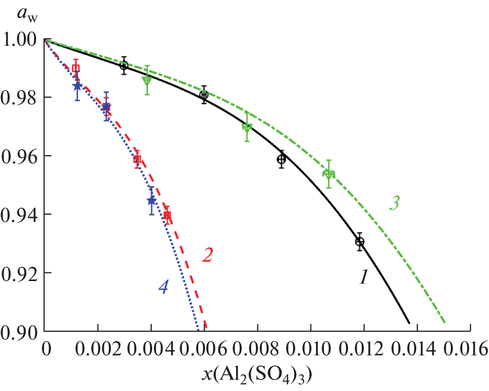 The vapor pressure in the H2O–Na2SO4–Al2(SO4)3 system at 15, 25, and 35°C was measured by a static method. The vapor pressure in the H2O–Al2(SO4)3 and H2O–Na2SO4–Al2(SO4)3 systems at 25 and 50°C was measured by the dew point method. A set of parameters of the Pitzer–Simonson–Clegg (PSC) model was determined to describe adequately vapor– liquid equilibria in the H2O–Al2(SO4)3 and H2O–Na2SO4–Al2(SO4)3 systems in the temperature range from 15 to 50°С.