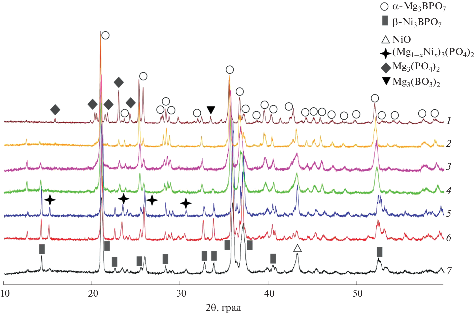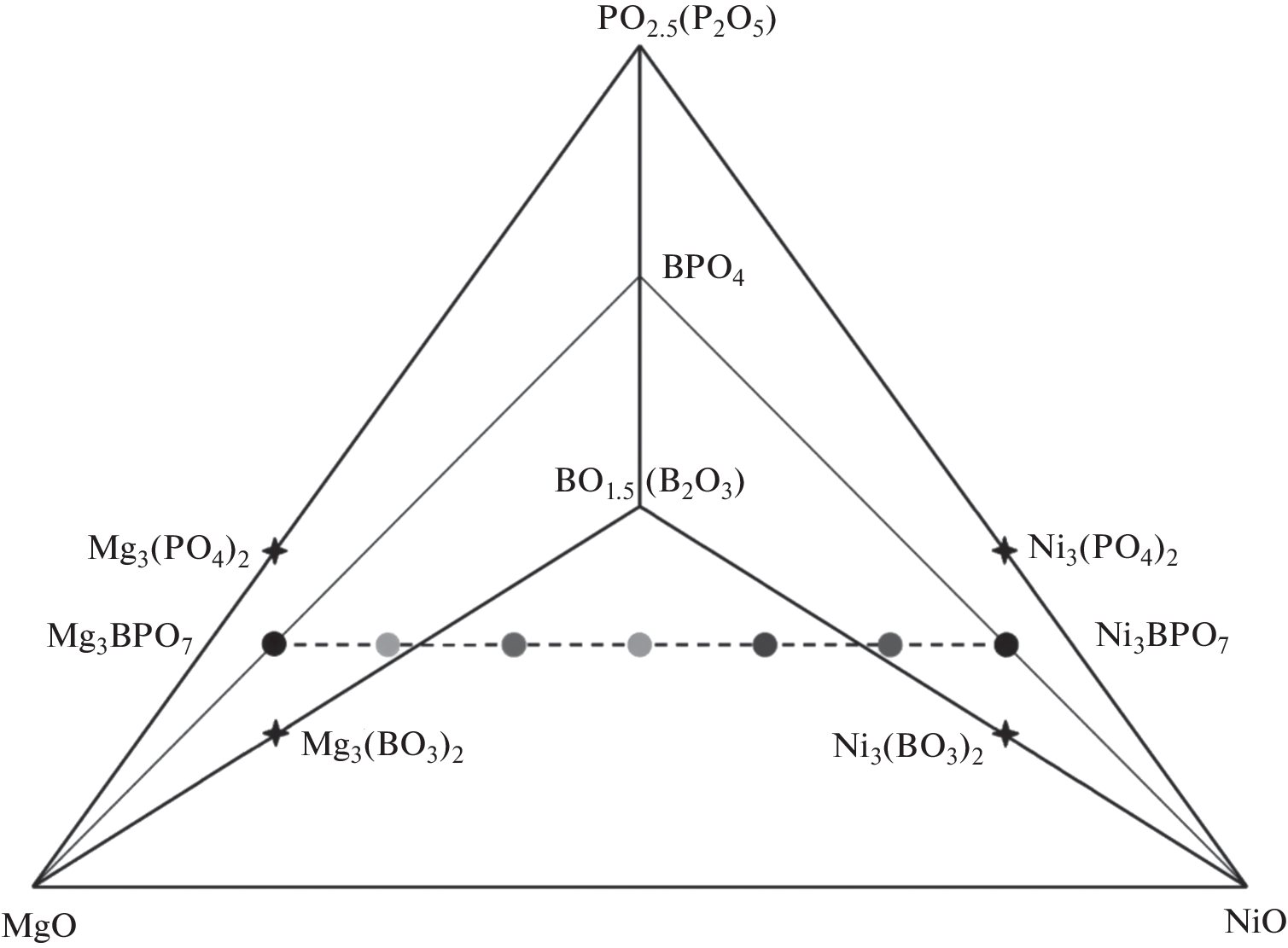 The Mg3 – nNinBPO7 (n = 0.0, 0.5, 1.0, 1.5, 2.0, 2.5, and 3.0) samples were prepared by solid-phase reactions at 980°C followed by inertial cooling, and then were characterized by X-ray powder diffraction, IR spectroscopy, diffusive reflectance and X-ray fluorescence spectrometry. It was for the first time that experiments yielded Ni3BPO7 crystals having the β-Zn3BPO7 non-centrosymmetrical hexagonal structure. The α-Mg3BPO7 and Ni3BPO7 coexistence range was determined. The diffuse reflectance spectra of an Mg1.5Ni1.5BPO7 sample featured a strong Ni2+ absorption band in the blue spectral range.
