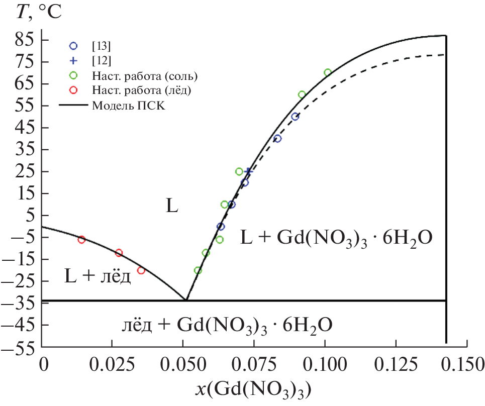 Solid–liquid equilibria in the system H2O–Gd(NO3)3 were measured from –20 to 70°C using the isothermal saturation method. The Pitzer–Simonson–Clegg thermodynamic model was implemented to obtain the temperature dependence of Gd(NO3)3⋅6H2O solubility constant, to calculate salt solubility and to construct a phase diagram of the system from eutectic point to hydrate melting. Thermochemical properties of gadolinium nitrate aqueous solutions, such as dilution enthalpies and heat capacities, were assessed also. The model has shown to be reliable for phase equilibria calculation from –35 to 90°C and from 0 up to ~15 mol % of salt as well as the thermodynamic properties of Gd(NO3)3 aqueous solutions at room temperature and around it.