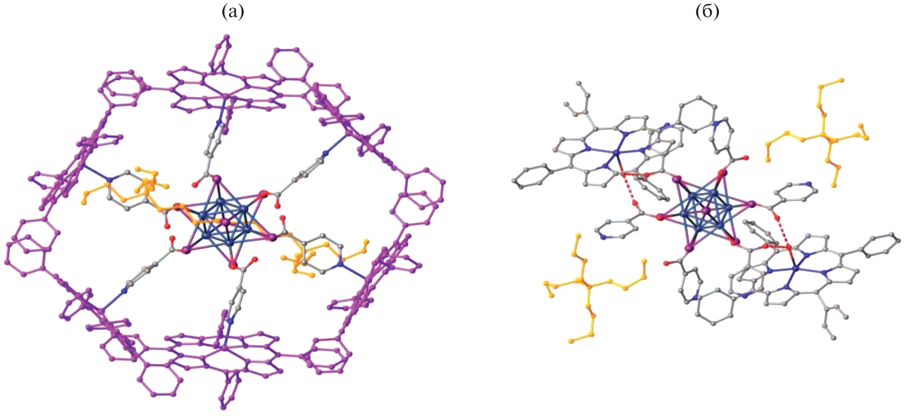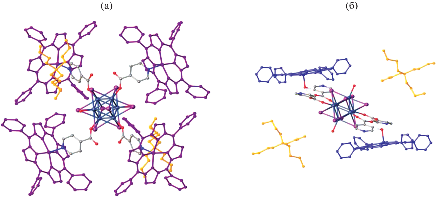 The possibility of the formation of supramolecular hybrids based on two photosensitizers, an octahedral molybdenum(II) iodide cluster with six terminal isonicotinate ligands (Bu4N)2[{Mo6I8}(OOC–C5H4N)6] (PyMoC, C) and A4-type zinc(II) porphyrin (ZnTPP, P), has been demonstrated. Spectrophotometric and NMR titration methods have shown that the formation of CPn complexes (n = 1–6) occurs in solutions of noncoordinating chlorinated solvents due to the formation of metal–N-ligand coordination bonds between the components. The use of an octahedral cluster as a hexatopic N-ligand and the lability of the Zn···NPy bonds together lead to the formation of a series of CPn complexes (n = 1–6), which are in dynamic equilibrium in solution. Nevertheless, conditions have been selected to isolate single crystals of individual forms CP4 + 2 and CP6 + 2, and their structures have been determined by X-ray diffraction analysis. The PyMoC cluster turns out to coordinate four or six ZnTPP molecules, respectively, while both structures contain two “extramolecules” of zinc(II) porphyrin bound to the cluster via hydrogen bonds involving the oxygen atoms of the isonicotinate groups and protons of water axially coordinated to the porphyrin metal center.