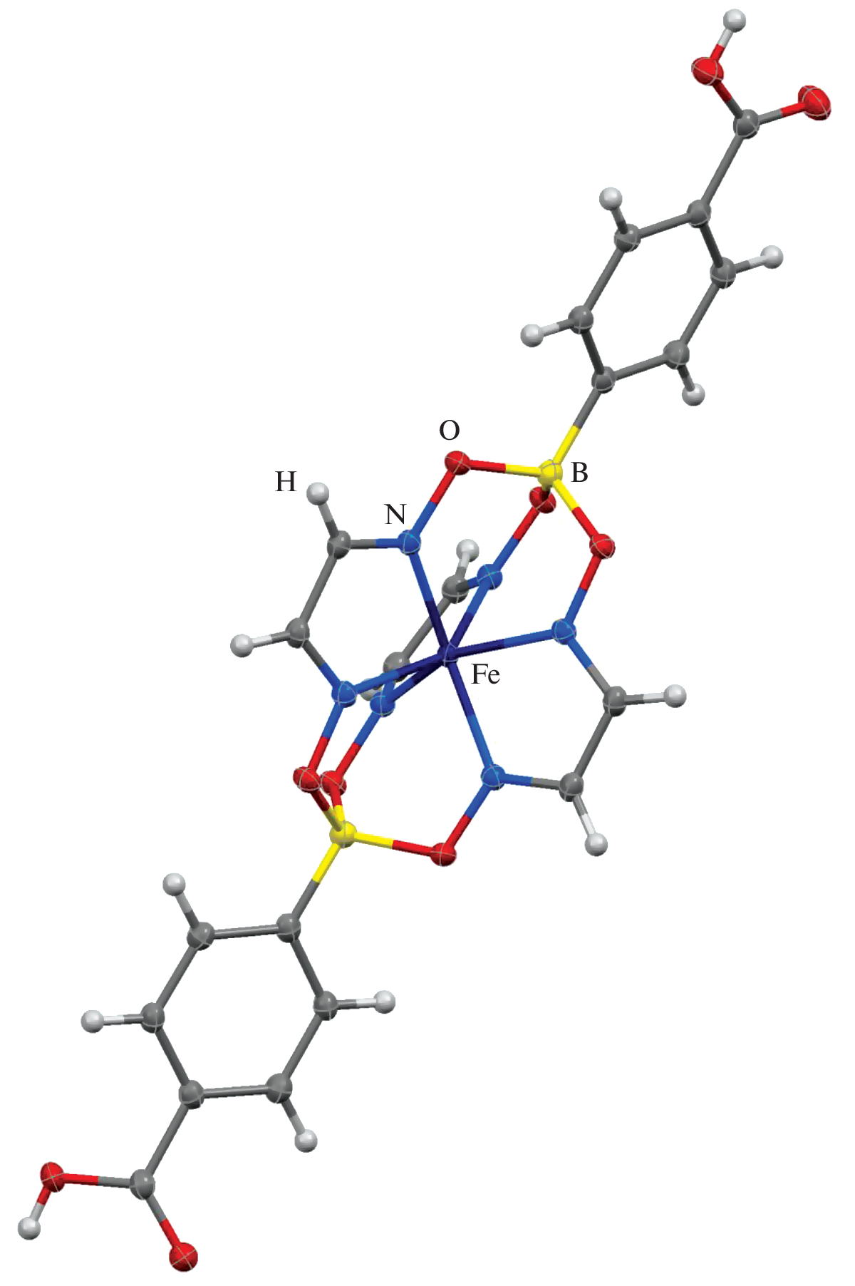 Template condensation of the chelating α-dioximate ligand synthon—glyoxime and the appropriate cross-linking agent—monofunctionalized boronic (3-carboxyphenylboronic or 4-carboxyphenylboronic) Lewis acid in a boiling nitromethane as a solvent on the iron(II) ion as a matrix afforded the dicarboxyl-terminated iron(II) tris-glyoximates with functionalizing meta- and para-substituents in their apical boron-based aromatic fragments. The composition and structure of these macrobicyclic complexes were confirmed using elemental analysis, UV-vis, 1H and 13C{1H} NMR spectra. Their crystal and molecular structures were obtained by the single crystal X-ray diffraction experiments. Asymmetric units of their crystals contain, besides of a clathrochelate molecule, two solvate molecules, which form hydrogen bonds with its functionalizing carboxyl groups. The C–O bond lengths in these terminal groups and a possibility of localization of hydrogen atoms on the difference Fourier maps clearly demonstrate that the formation of such associates does not include a deprotonation of the macrobicyclic complex and its intracomplex molecules remain neutral. The encapsulated iron(II) ion in their molecules occupies a centre of its FeN6-coordination polyhedron. Its geometry is intermediate between a trigonal prism (TP, the distortion angle φ = 0°) and a trigonal antiprism (TAP, φ = 60°); the values of φ are equal to 17.1 and 18.9°, respectively. Fe–N distances vary from 1.901(2) to 1.924(2) Å, thus suggesting a low-spin diamagnetic state of the encapsulated iron(II) ion. The C=N bonds in the donor oxime groups are shortened, while the С–С bonds in the chelating glyoximate fragments are elongated, as compared with those in their aliphatic analogs. Free rotation of the apical aromatic substituents at the cross-linking boron atoms around the ordinary B–C bonds caused the absence of their coplanarity. The intramolecular distances С···С between the terminal carboxyl groups in the apical cross-linking fragments are equal to 15.693(4) and 17.888(3) Å for the clathrochelate meta- and para-isomers, respectively. The aforementioned rotation allows to achive an angular geometry of the prospective meta-dicarboxyloclathrochelate ligand with a formation of ∠C···Fe···C close to 145° between its terminal O‑donor carboxyl groups. This complex can play a role of both the angular and linear 3D-ligands, while its clathrochelate para-substituted isomer seems to be the prospective linear metalloligand.