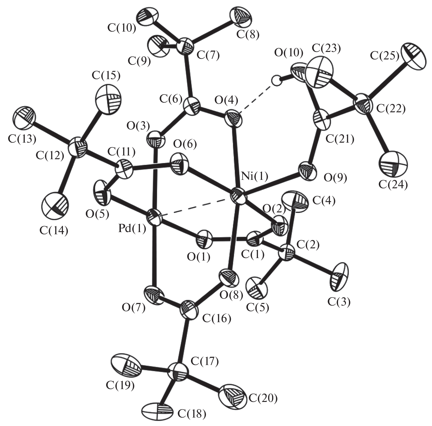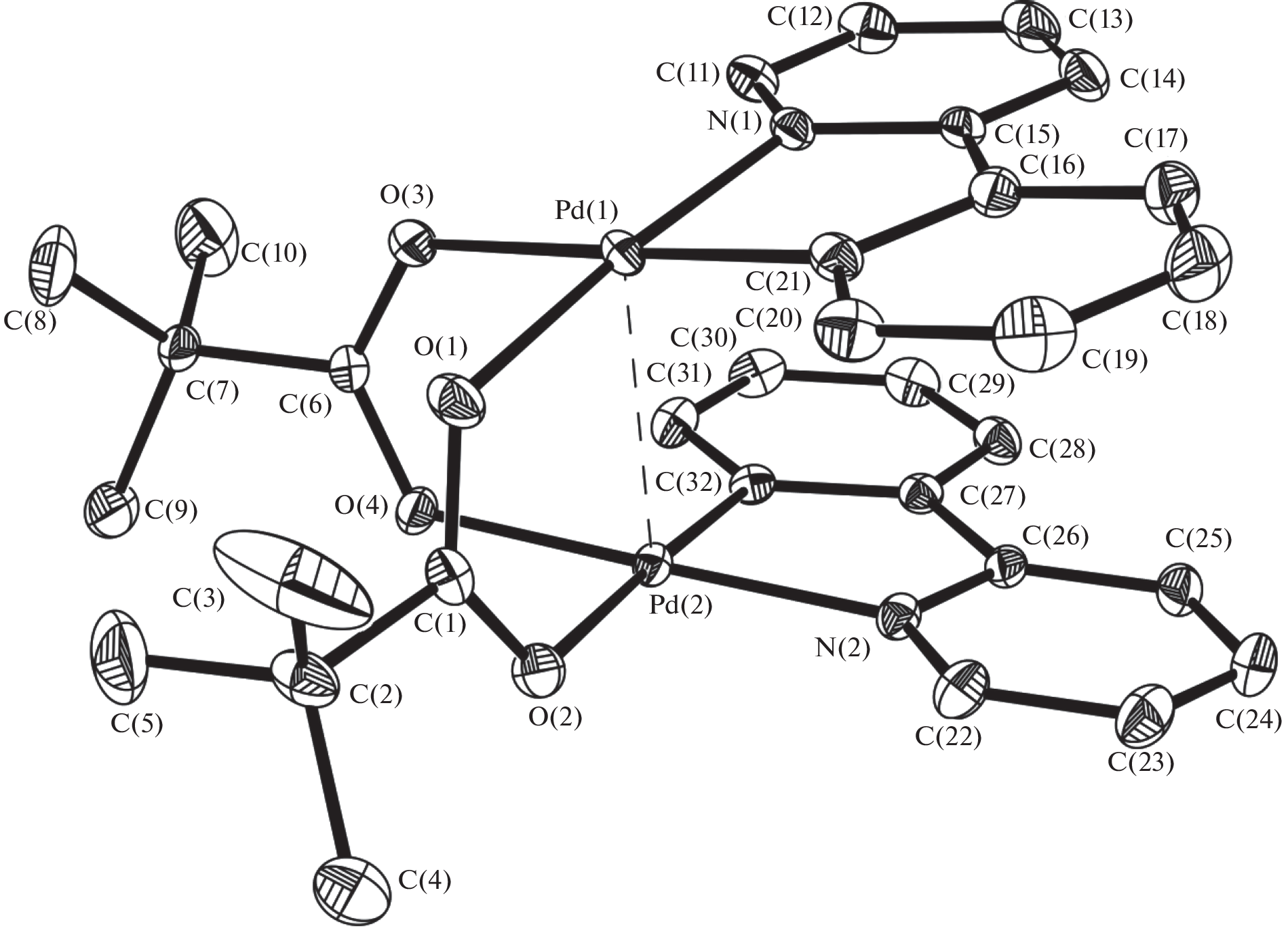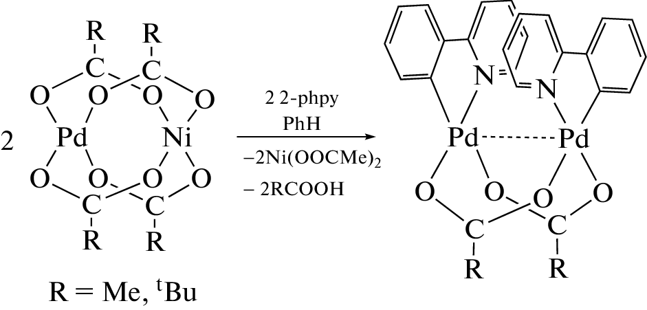 New bimetallic pivalate Pd(II) complex [PdNi(OOCtBu)4(HOOCtBu)] (I) has been synthesized from [PdNi(OOCMe)4] and used as a starting reagent in a further complexation reaction. Cyclometallated binuclear carboxylate palladium complexes [(OOCMe)Pd(2‑phpy)]2 (II) and [(OOCtBu)Pd(2‑phpy)]2 (III) have been obtained by the reaction between heterometallic compounds [Pd(OOCR)4Ni] (R = Me, tBu) and 2-phenylpyridine (2-phpy). The reaction proceeds at room temperature under mild conditions. All the compounds obtained have been isolated in crystalline form from a medium of nonpolar solvents, characterized by single-crystal X-ray diffraction analysis, and deposited at the Cambridge Crystallographic Data Center (CCDC nos. 2256606 for I, 2247942 for II, and 2247943 for III).