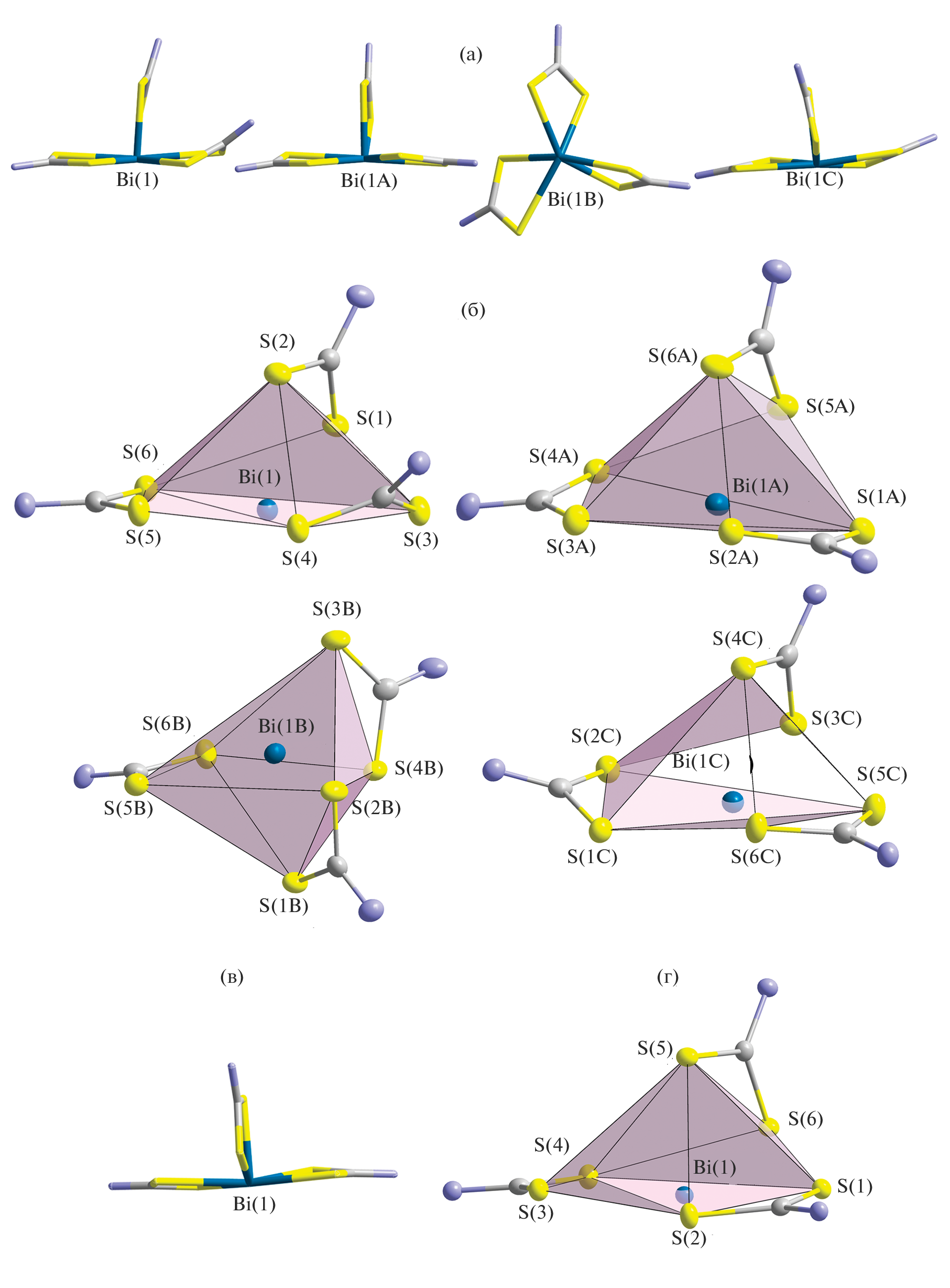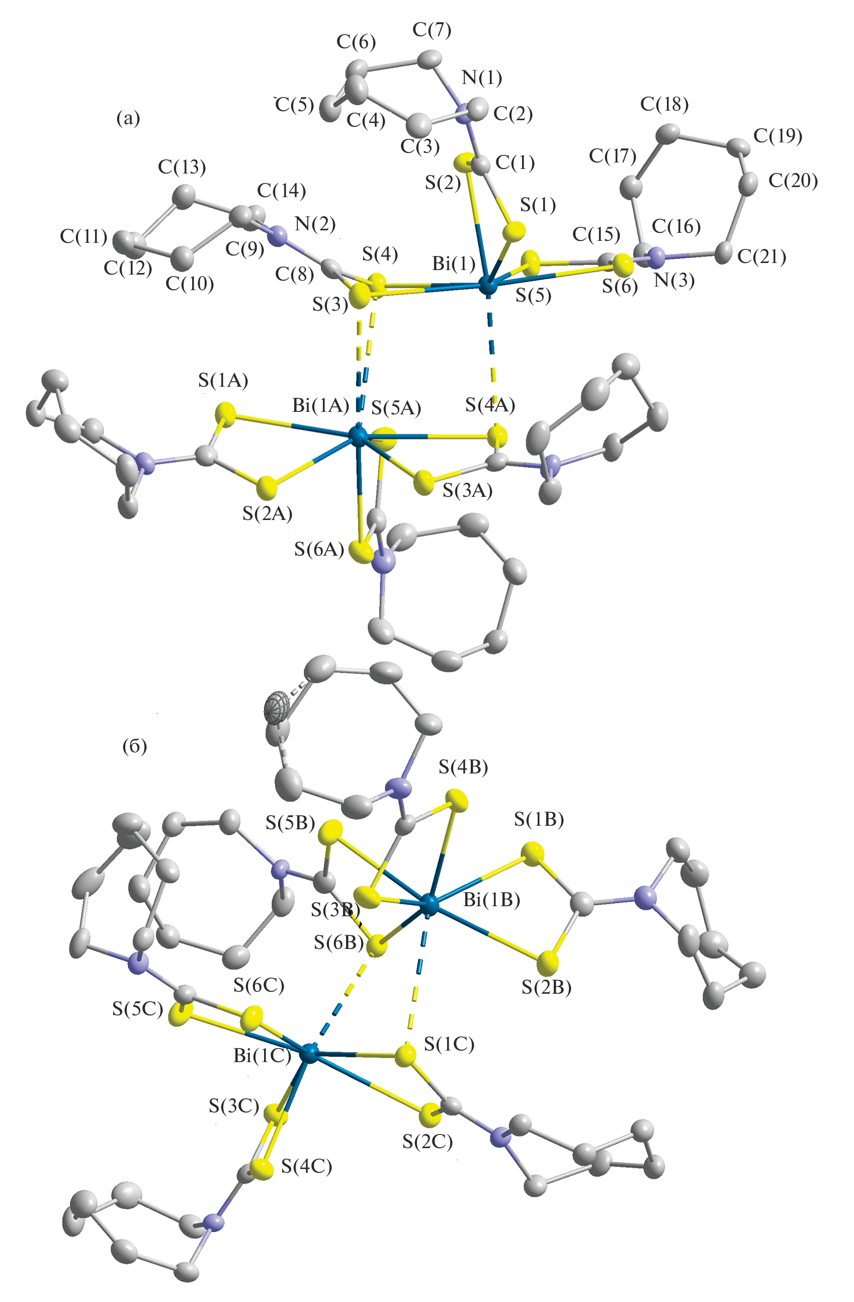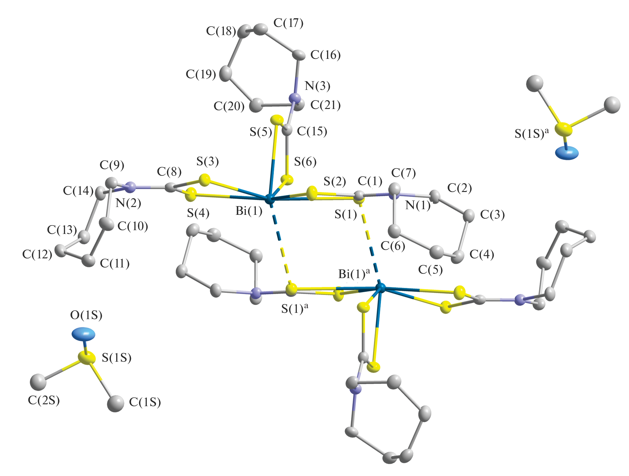 Bismuth(III) hexamethylenedithiocarbamate (HmDtc) [Bi2{S2CN(CH2)6}6] (I) and its solvated with dimethyl sulfoxide form [Bi2(S2CNHm)6]⋅2(CH3)2SO (II) have been obtained. The crystal structure of compound I shows an unusual alternation of two unsymmetrical isomeric pseudo-binuclear [Bi1/1B(HmDtc)3···Bi1A/1C(HmDtc)3] molecules, each of which involves two non-equivalent mononuclear moieties combined by secondary Bi···S bonds. The solvation of complex I leads to the structural unification of isomeric [Bi(HmDtc)3] molecules followed by their self-organization into centrosymmetric pseudo-dimers in the structure of compound II. All HmDtc ligands coordinate in S,S'-anisobidentate mode to form four isomeric (in I) or structurally unique [Bi(HmDtc)3] molecules (in II), whose distorted polyhedra can be approximated by pentagonal pyramid or octahedron. Solvating DMSO molecules are retained in the structure II by C–H···O hydrogen bonds. The analysis of energy dispersive X-ray spectra allowed one to identify the residual matter obtained by thermolysis of the complexes as Bi2S3 with admixture of Bi0.