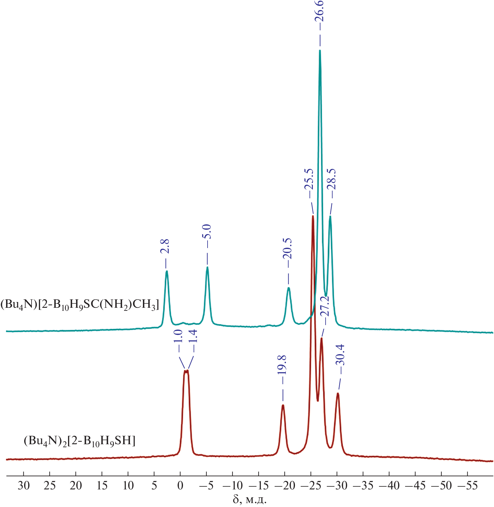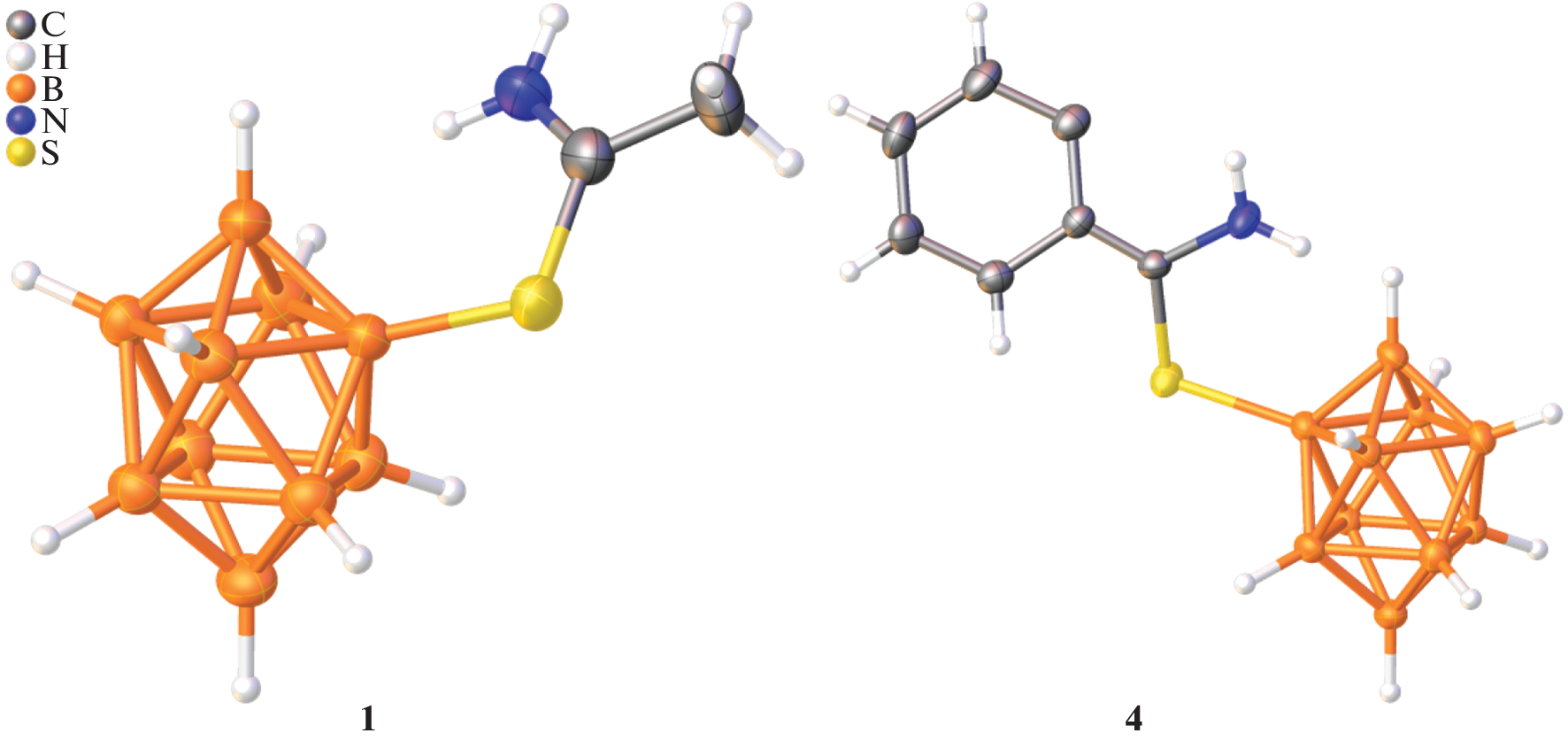 New iminium derivatives of the sulfonio-closo-decaborate anion have been obtained in the form of tetrabutylammonium salts (Bu4N)[2-B10H9SC(NH2)R] (R = –CH3, –CH2CH3, –CH(CH3)2, –Ph, –PhCH3), in which the iminium group acts as a protective group and allows further modification of the boron cluster anion without acting the sulfonium group. The compounds have been studied by elemental analysis, IR and 11B, 1H, 13C NMR spectroscopies. The structure of compounds (Bu4N)[2-B10H9SC(NH2)CH3] and (Bu4N)[2-B10H9SC(NH2)Ph] has been confirmed by X-ray diffraction analysis. The yield of final compounds is >80%.