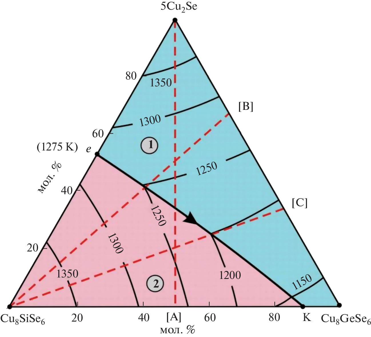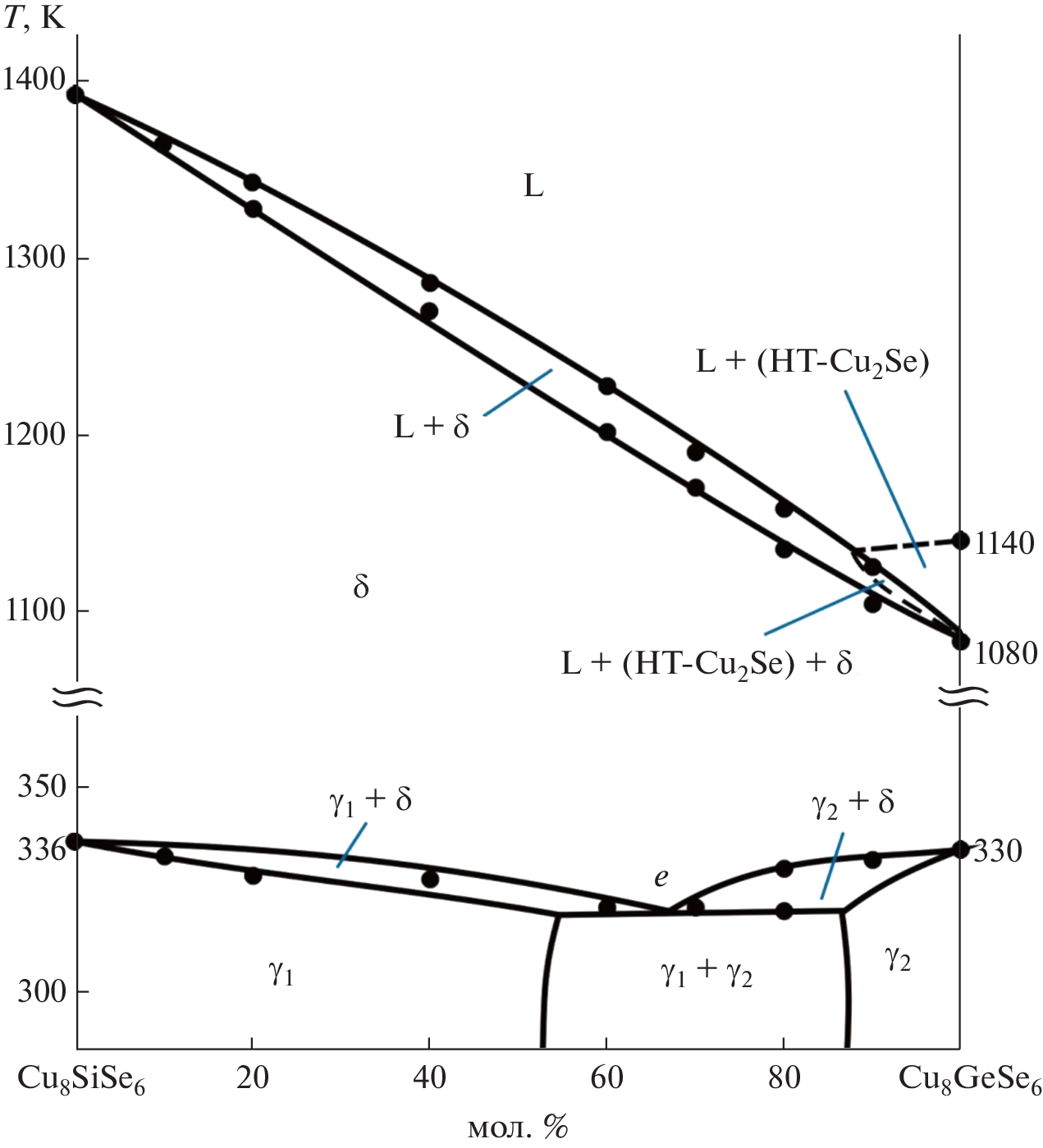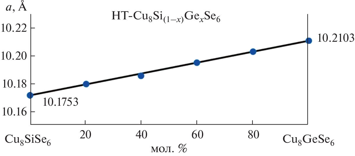 Phase equilibria in the Cu2Se–Cu8SiSe6–Cu8GeSe6 area of the Cu2Se–SiSe2–GeSe2 system have been studied using differential thermal analysis (DTA), X-ray powder diffraction analysis (XRD), scanning electron microscopy (SEM), and energy-dispersive spectroscopy (EDX). The results served to plot a Т–х diagram of the Cu8SiSe6–Cu8GeSe6 boundary system, a series of polythermal sections, and a 300-K isothermal section of the phase diagram and a liquidus surface projection for the title system. The primary crystallization and homogeneity fields of phases, and the characters and temperatures of invariant and monovariant equilibria have been determined. In the Cu8SiSe6–Cu8GeSe6 boundary system, continuous solid solutions have been found to exist between the high-temperature phases of the terminal compounds and extensive homogeneity area based on their low-temperature phases were found. The crystal lattice types and unit cell parameters have been determined for the terminal compounds and both phases of solid solutions using X-ray powder diffraction data. The prepared phases of variable composition are of interest as environmentally friendly functional materials.