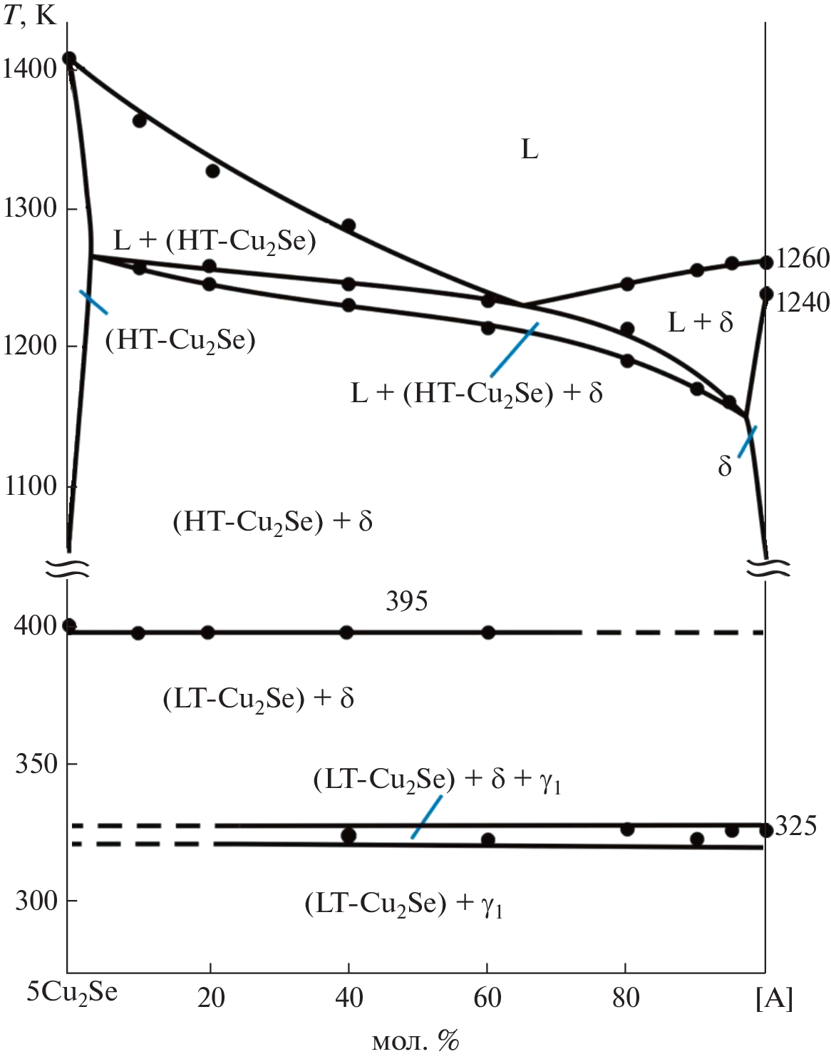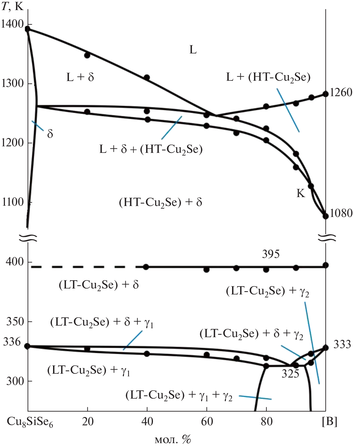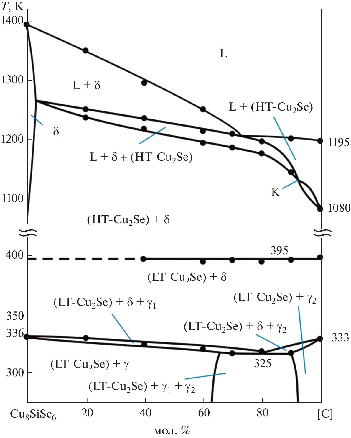 Phase equilibria in the Cu2Se–Cu8SiSe6–Cu8GeSe6 area of the Cu2Se–SiSe2–GeSe2 system have been studied using differential thermal analysis (DTA), X-ray powder diffraction analysis (XRD), scanning electron microscopy (SEM), and energy-dispersive spectroscopy (EDX). The results served to plot a Т–х diagram of the Cu8SiSe6–Cu8GeSe6 boundary system, a series of polythermal sections, and a 300-K isothermal section of the phase diagram and a liquidus surface projection for the title system. The primary crystallization and homogeneity fields of phases, and the characters and temperatures of invariant and monovariant equilibria have been determined. In the Cu8SiSe6–Cu8GeSe6 boundary system, continuous solid solutions have been found to exist between the high-temperature phases of the terminal compounds and extensive homogeneity area based on their low-temperature phases were found. The crystal lattice types and unit cell parameters have been determined for the terminal compounds and both phases of solid solutions using X-ray powder diffraction data. The prepared phases of variable composition are of interest as environmentally friendly functional materials.