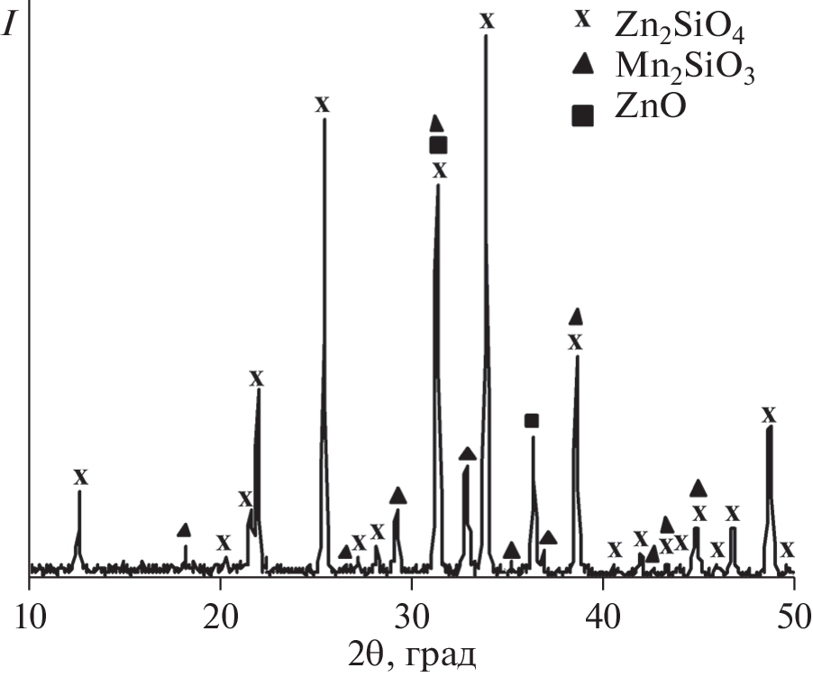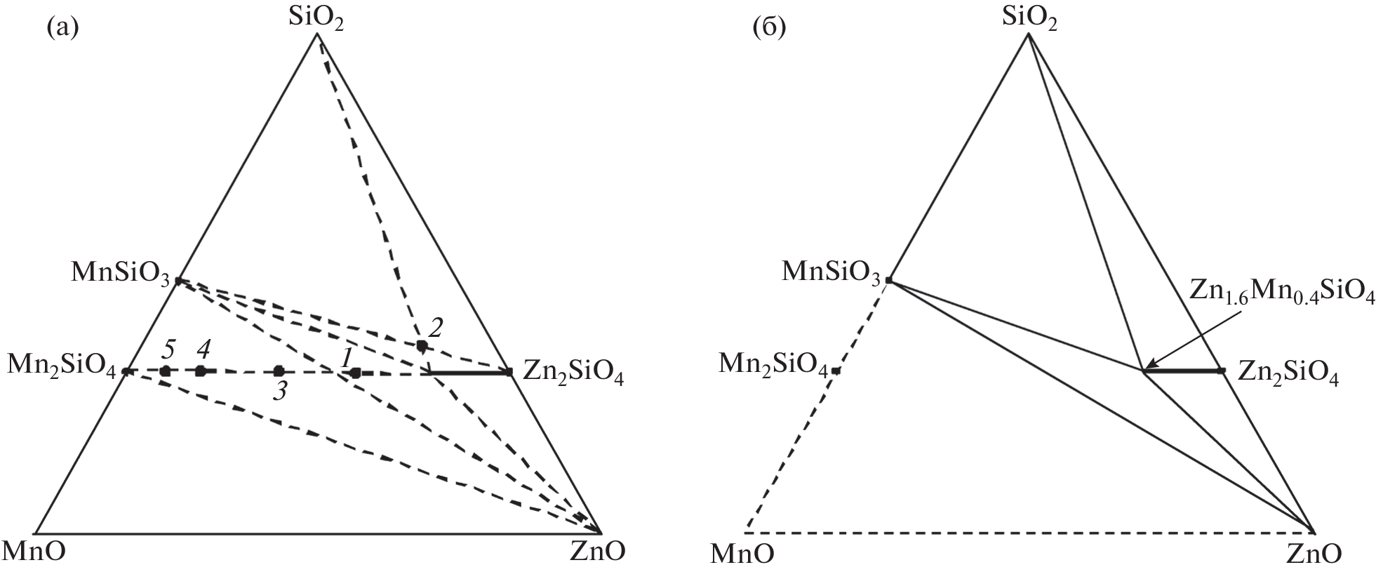 The subject matter of this work was the triangulation of the Mn2O3–ZnO–SiO2, Mn3O4–ZnO–SiO2, and MnO–ZnO–SiO2 systems and the determination of phase transformations to yield Zn2 – 2хMn2хSiO4 solid solution. Equilibrium phase diagrams have been plotted taking into account the existence temperatures of each of the manganese oxides, phase compositions of the constituent binary systems, and checkup points, whose phase compositions helped us to determine the positions of secondary triangles. The phase compositions of reaction products of the terminal oxides and the phase transformation sequence during Zn2 – 2хMn2хSiO4 synthesis were monitored by X-ray powder diffraction and thermal analysis. Phase ratios in the MnOх–ZnO–SiO2 system are caused by the charge states of manganese ions changing in response to rising temperature. The triangulation of the Mn2O3–ZnO–SiO2 system at 800°С is determined by the ZnMn2O4–Zn2SiO4 tie-line and partitions the system to the ZnO–Zn2SiO4–ZnMn2O4, Zn2SiO4–ZnMn2O4–SiO2, and ZnMn2O4–SiO2–Mn2O3 simplex triangles. The Zn2 – 2хMn2хSiO4 solid solution with an extent limited to Zn1.6Mn0.4SiO4 is formed at temperatures above 1000°С. The triangulation of the MnO–ZnO–SiO2 ternary system is determined by the Zn1.6Mn0.4SiO4–ZnO–MnSiO3 simplex triangle.