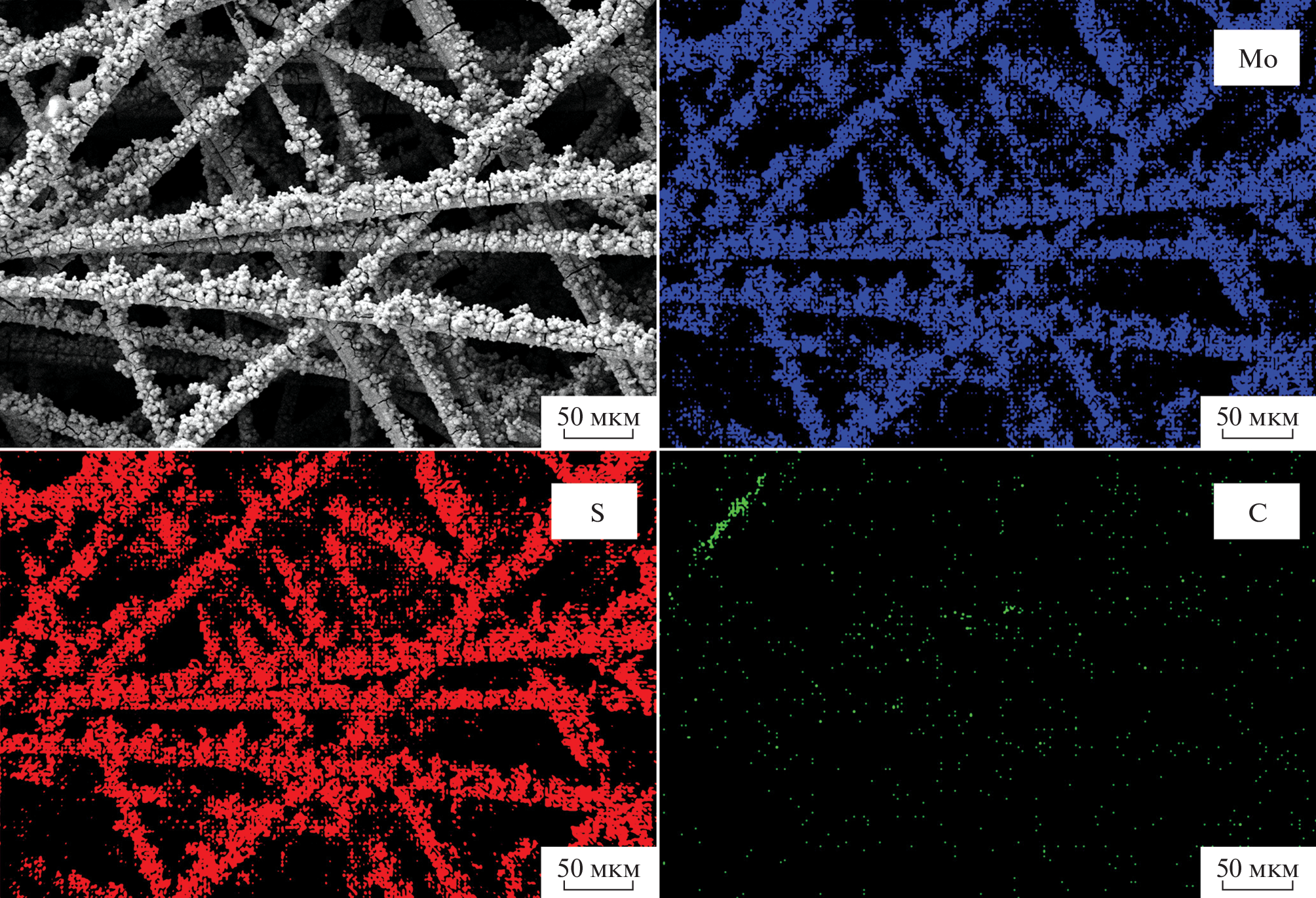 The formation of hierarchically organized MoS2 films on various substrates by a hydrothermal method was studied. The influence of synthesis conditions and the substrate (a glass or a flexible carbon paper substrate) on the crystal structure of sulfide films was determined using X-ray powder diffraction (XRD). Scanning electron microscopy (SEM) showed that the films on glass substrates comprised structurally different elements, namely a continuous dense layer of spherical nanoparticles on the surface of which hierarchically organized globular agglomerates of two types are arranged. A molybdenum disulfide shell about 1.5 μm thick, consisting of hierarchically organized nanosheets less than 10 nm thick, was formed on the surface of carbon fibers that make up the carbon paper. Elemental mapping was used to evaluate the homogeneity of the MoS2 film formed on the carbon paper. Atomic force microscopy (AFM) showed that an individual carbon fiber modified with a sulfide film had a mean square roughness of about 13 nm (over an area of about 100 μm2). According to Kelvin-probe force microscopy (KPFM) data, the electron work function of the material was 4.53 eV. The electrochemical characteristics of the manufactured flexible electrode based on a hierarchically organized molybdenum disulfide film were investigated. The specific capacitance and the stability of functional and microstructural properties of the manufactured supercapacitor electrode in 2000 charge–discharge cycles were evaluated. Thus, the proposed strategy is promising for the fabrication of efficient hierarchically organized MoS2 electrodes for flexible supercapacitors.