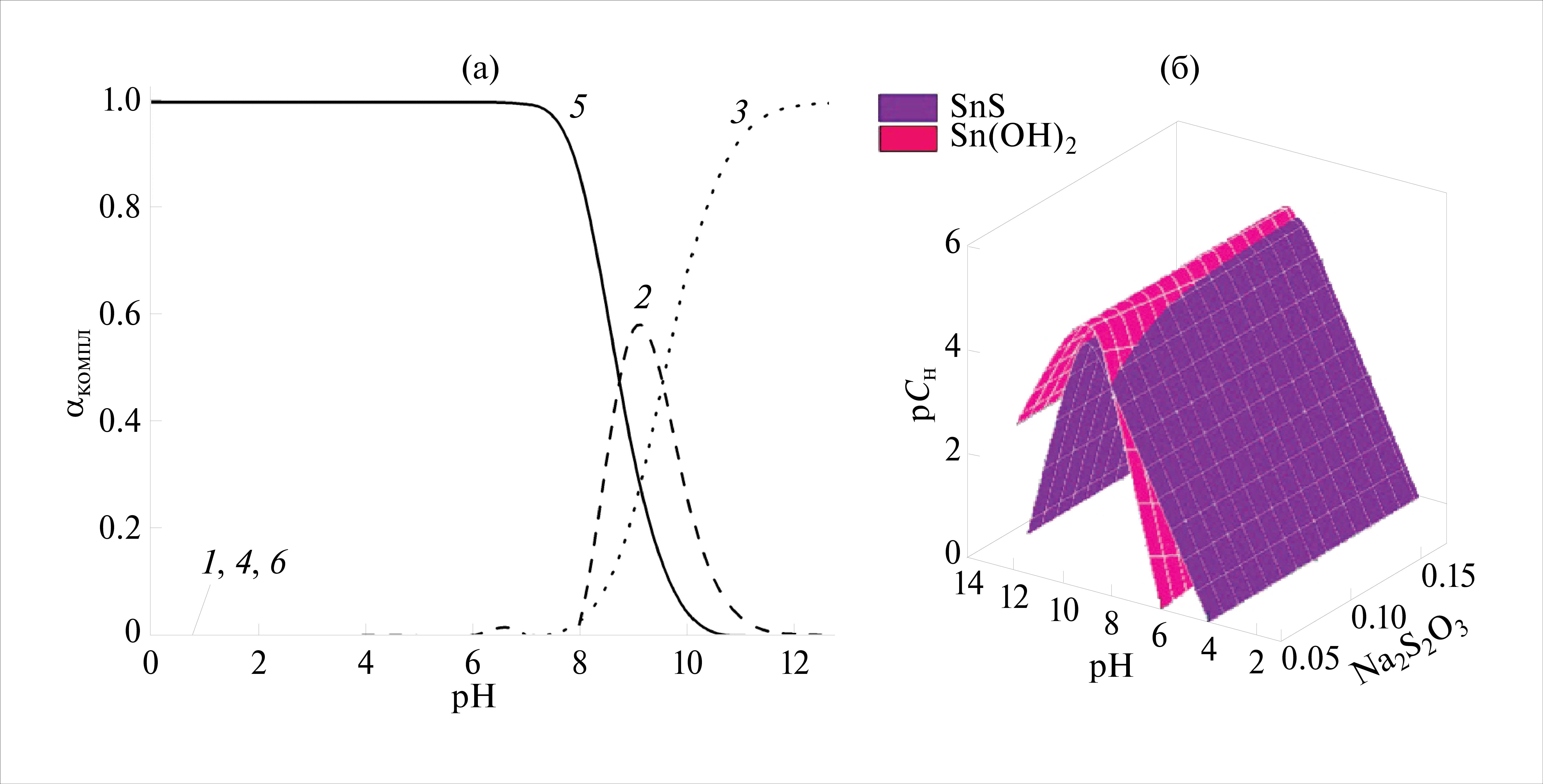 Рис. 1. Термодинамический анализ начальных условий образования твердой фазы SnS в водном растворе при 298 K: а — долевые концентрации (a) комплексов SnOH+ (1), Sn(OH)2 (2), Sn(OH)3− (3), SnCit− (4), SnCit24− (5), Sn(OH)Cit2− (6), образующихся в реакционной системе SnCl2–Na3Cit–Н2O; б — граничные условия образования твердых фаз SnS и Sn(OH)2 в зависимости от pH среды и концентрации Na2S2O3 в реакционной системе SnCl2–Na3Cit–Na2S2O3–Н2O.
