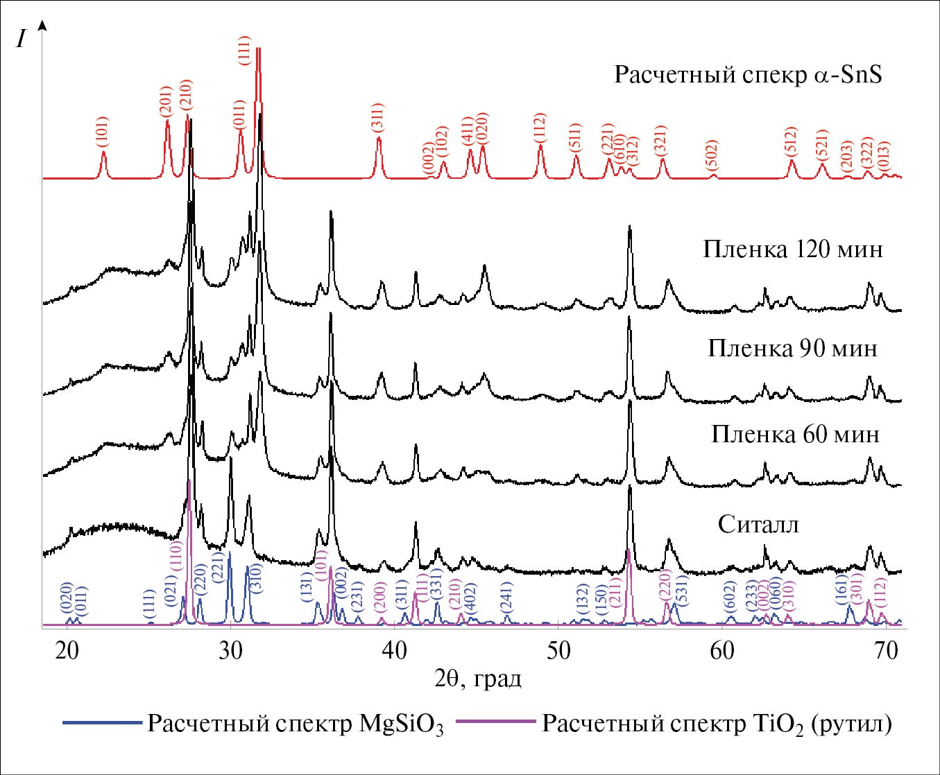 На рис. 2 приведены экспериментальные рентгенодифракционные спектры тонких пленок SnS на ситалловой подложке и спектр ситалловой подложки без пленки. Кроме того, показаны теоретические спектры á-SnS и основных компонентов ситалла (силиката магния MgSiO3 и рутила TiO2). На рентгенограммах пленок SnS, полученных при различной длительности синтеза, присутствует набор дифракционных отражений, характерный для орторомбической структуры á-SnS (пр. гр. Pnmа). Рентгенофазовый анализ не выявил наличия в пленке других, помимо á-SnS, оловосодержащих кристаллических фаз. Точный размер областей когерентного рассеяния (ОКР) экстраполяционным методом Вильямсона—Холла [28] установить сложно из-за наличия анизотропии уширения дифракционных рефлексов. Усредненное значение ОКР одинаково для всех образцов пленок и составляет 26 нм, что свидетельствует о прекращении роста монокристаллических частиц SnS после 60 мин синтеза.