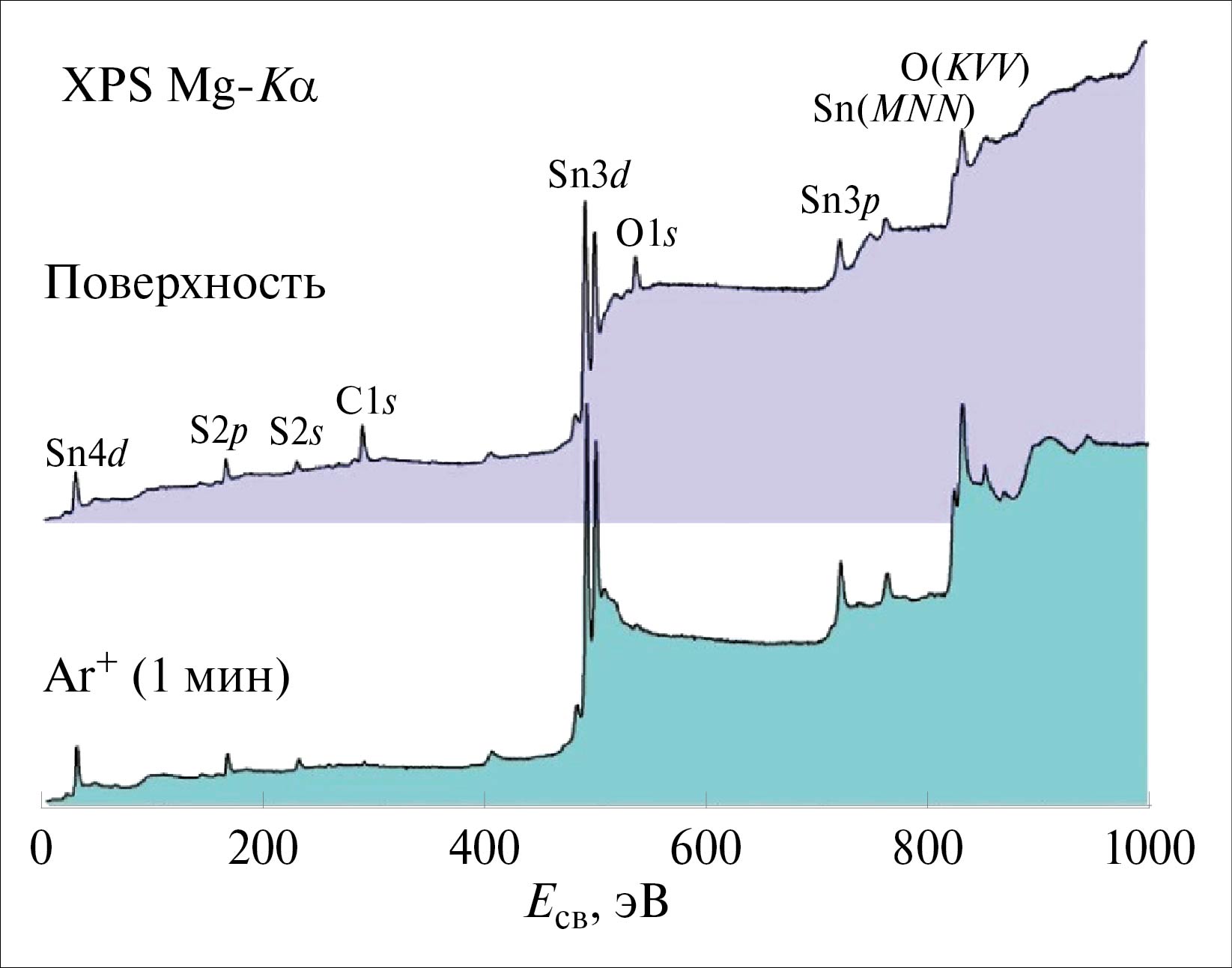 Изучение элементного состава, химического и электронного состояния элементов на поверхности изучаемых пленок проводили также методом РФЭС. На рис. 4 приведены обзорные РФЭ-спектры пленки до и после травления, отмечены линии олова Sn3p, Sn3d и Sn4d, серы S2p и S2s, кислорода O1s, углерода C1s, а также Оже-линии кислорода и олова. Из полученных спектров видно, что как на поверхности, так и в объеме присутствуют основные элементы материала тонкой пленки (олово и сера), а также побочные элементы — O и C. Других элементов, например Si, Ti, Mg, что говорило бы о включении в спектр материала подложки, или Cl, что указывало бы на наличие примесей исходной соли олова, обнаружено не было.