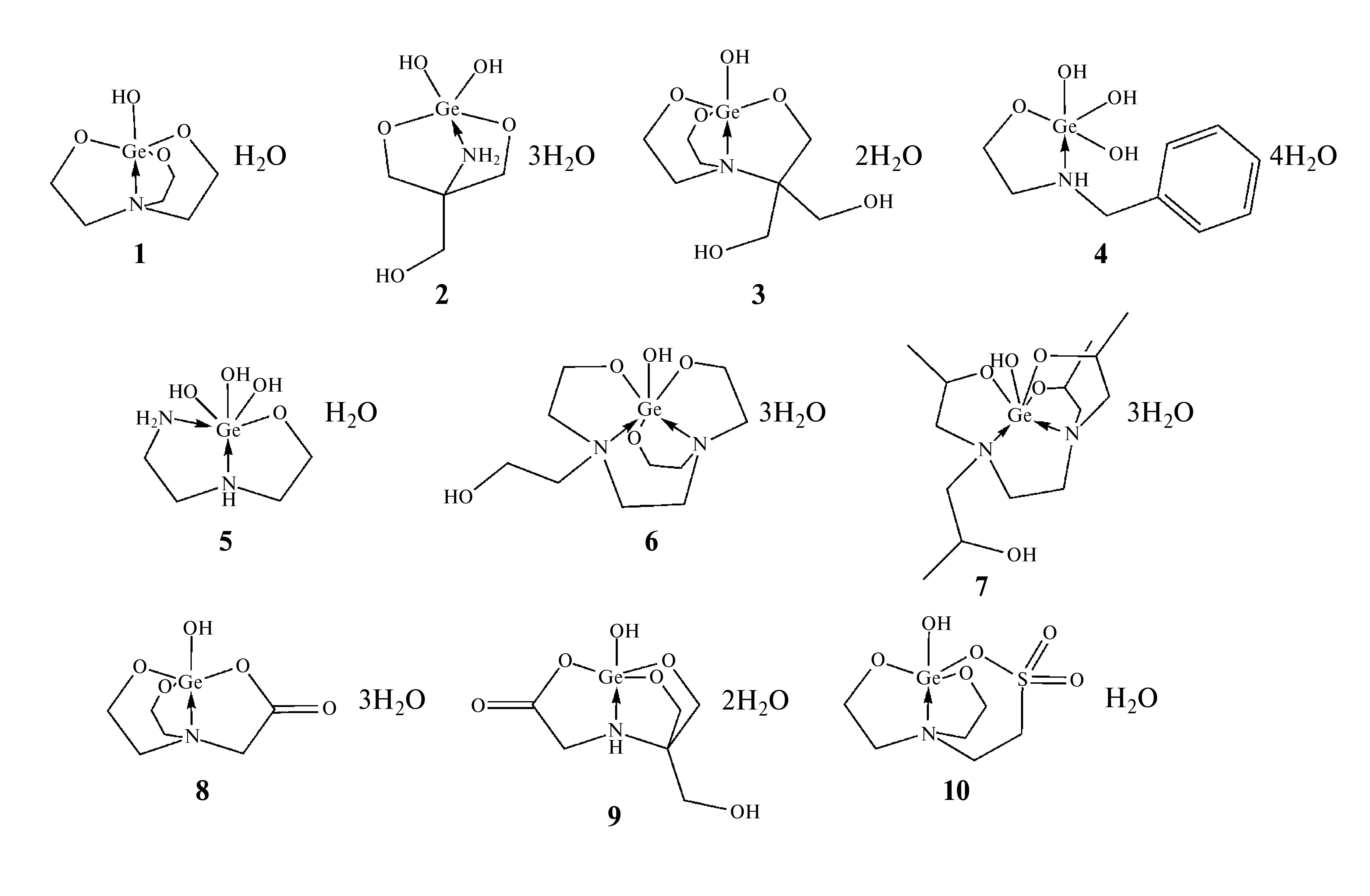 Соединения германия с гидроксиалкиламинами, содержащими трансаннулярную донорно-акцепторную связь N → Ge, широко известны как герматраны [2]. 1-Герматранол гидрат [OHGe(OCH2CH2)3N] · H2O является наиболее изученным представителем герматранов. Его синтез основан на простом взаимодействии диоксида германия с триэтаноламином в воде [15]. Многолетние исследования показали, что 1-герматранол гидрат стимулирует иммунную систему, может применяться для профилактики пародонтита, гингивита и кариеса, оказывает актопротекторное и антиоксидантное действие, активирует триптофанил-тРНК-синтетазу, интенсифицирует рост растений [16–20].
