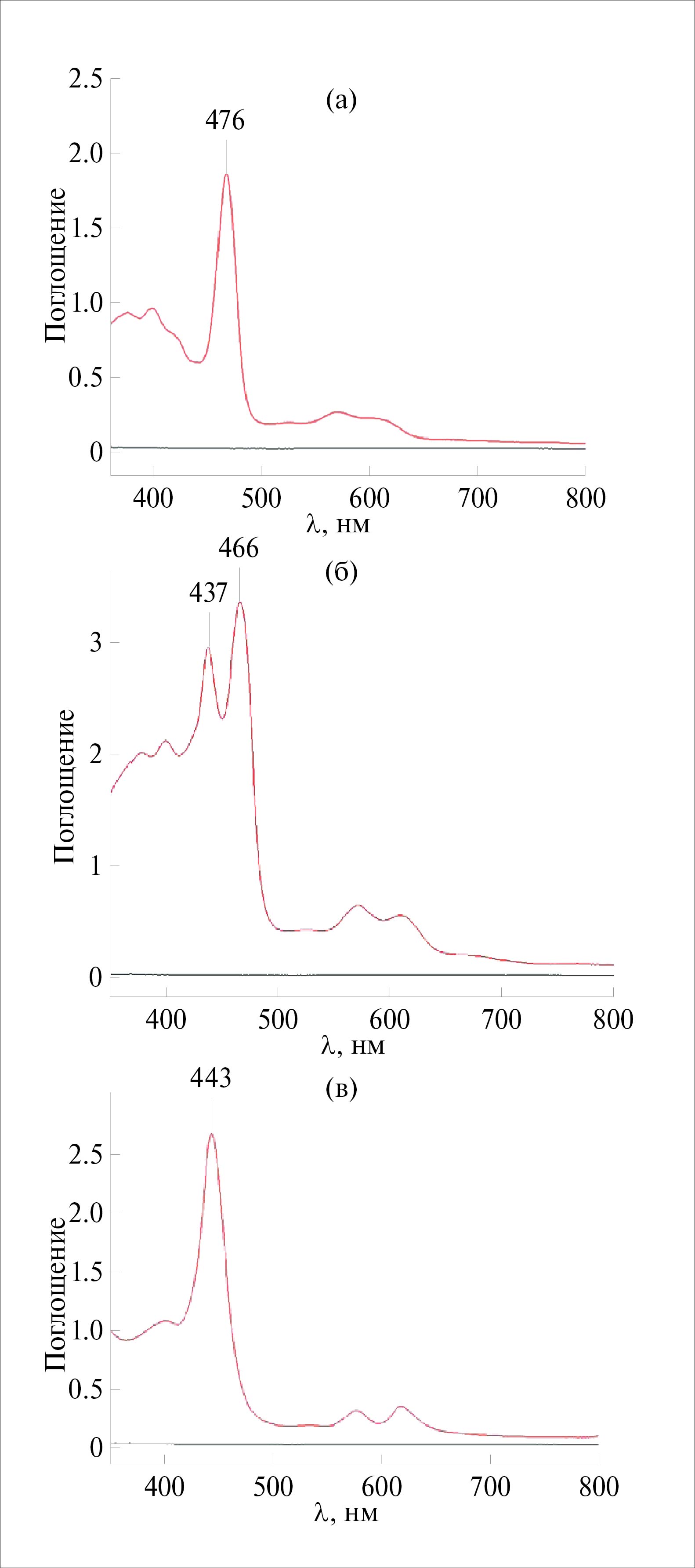 Рис. 1. ЭСП комплекса: а — марганца(III) 5 в хлороформе (C = 3 × 10–5 моль/л), 25°C; б — смеси комплексов Mn(II) и Mn(III) с 5-(4-нитрофенил)-10,15,20-трифенилпорфирином в ДМФА при растворении (С ~ 5.5–6.0 × 10–5 моль/л), 25°C; в — комплекса Mn(II) 8 в этаноламине (С = 4.1 × 10–5 моль/л), 25°C.
