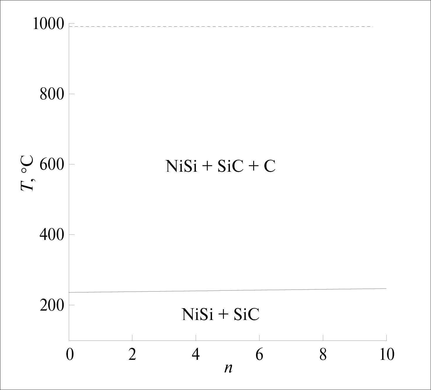 В результате моделирования была получена равновесная CVD-диаграмма, показывающая зависимость состава пленок от условий синтеза – температуры реактора и состава газовой фазы. CVD-диаграмма, отражающая влияние содержания водорода (n) в исходном газовом потоке на результаты процесса осаждения, показана на рис. 1. Как видно из рисунка, в результате процесса CVD в данной системе может быть получено два фазовых комплекса: NiSi + SiC и NiSi + SiC + С в области низких и высоких температур соответственно. Газовая фаза в данной системе при указанных условиях представляет собой смесь метана и водорода. При этом с повышением температуры реактора происходит разложение метана по реакции СН4 = С + 2Н2. Именно это равновесие определяет положение пограничной линии NiSi + SiC | NiSi + SiC + C на диаграмме. При высоких температурах газовая фаза состоит практически из одного водорода. Таким образом, фазовый комплекс, не содержащий графита, в данной системе может быть получен только в области сравнительно низких температур.