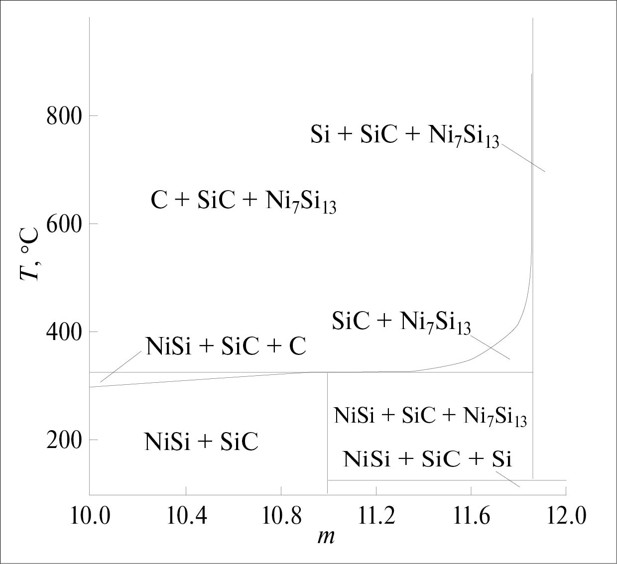 • при соответствующих условиях в этих системах образуются фазовые комплексы NiSi + SiC, NiSi + SiC + C, NiSi + SiC + Ni7Si13, NiSi + SiC + Si, SiC + Ni7Si13 и Si + SiC + Ni7Si13;