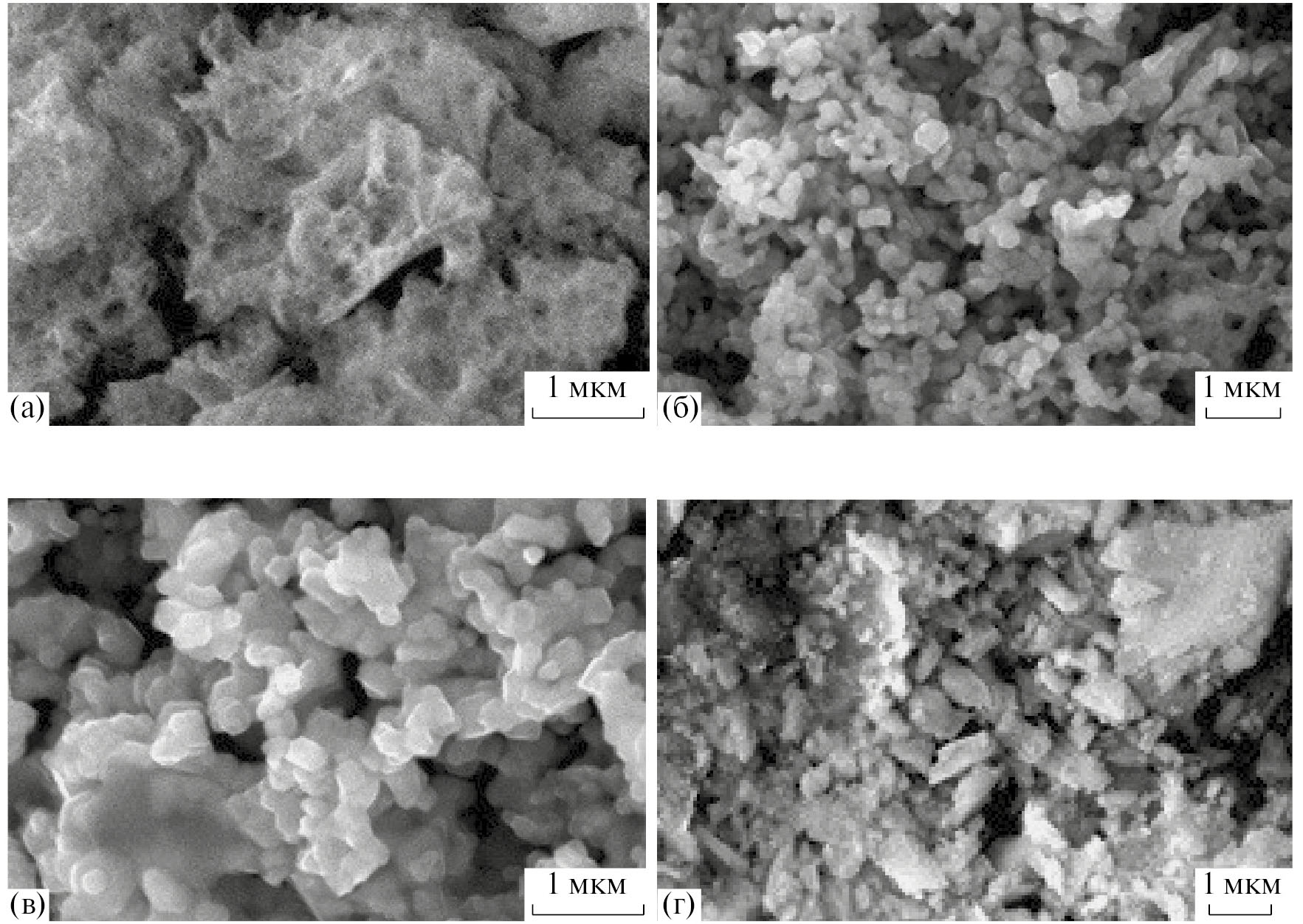Рис. 5. Объемное агрегирование наночастиц SrFe12O19 (а), возникновение протяженных агрегатов наночастиц (б, в), в значительной мере дезагрегированные частицы (г).