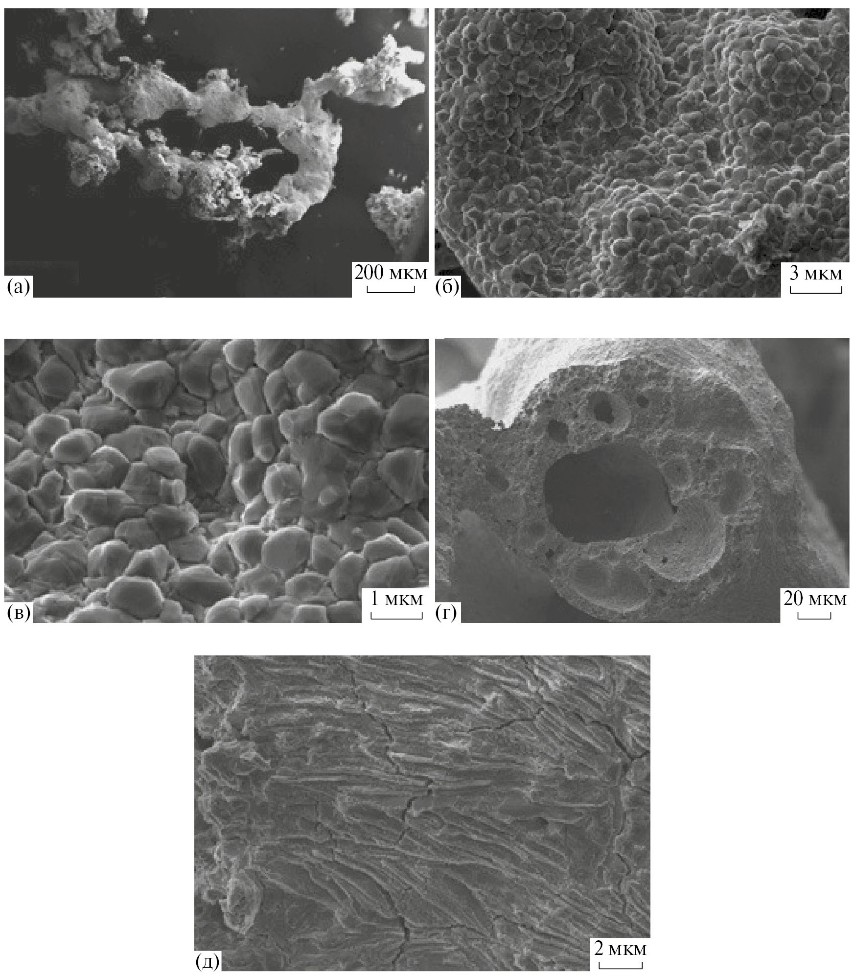 Рис. 7. Электронные микрофотографии образцов гексаферрита стронция, полученных из прекурсоров, содержащих глицин: а, б, в — внешний вид ягелеподобной структуры; г — то же на срезе; д — внутренняя часть “волокна”.