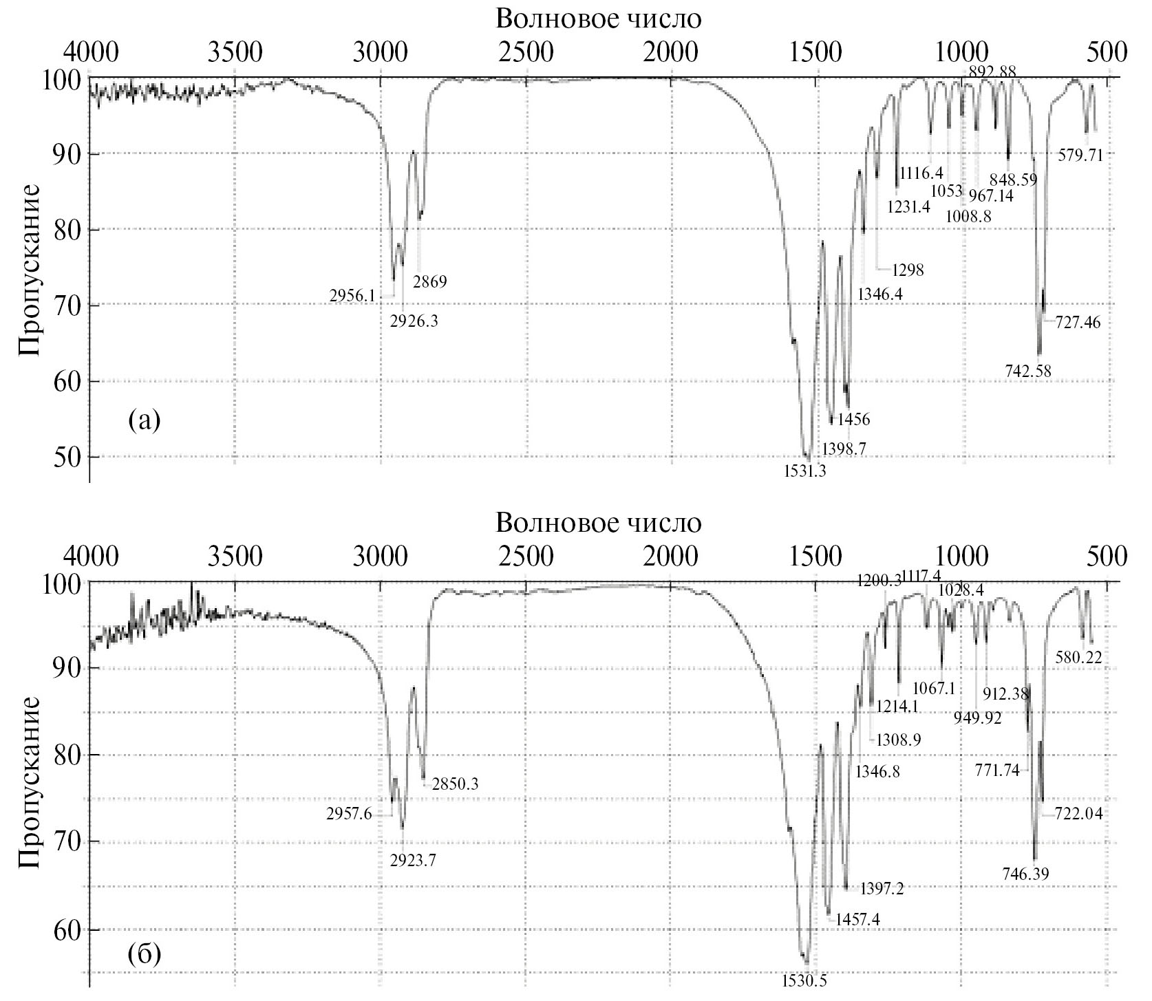 Гексановую кислоту предварительно очищали простой перегонкой при атмосферном давлении. Чистоту контролировали по температуре кипения, показателю преломления и ИК-спектрам. Полученные осадки солей отфильтровывали, промывали горячим гексаном для удаления остатков кислоты и сушили на воздухе. Гексан предварительно очищали от возможного присутствия перекисных соединений по методике [39]. В результате получены бесцветные кристаллические вещества, которые идентифицировали методами химического и ИК-спектроскопического анализа. ИК-спектры солей регистрировали на ИК-Фурье-спектрометре InfralumFT 801 в диапазоне волновых чисел 4000–500 см–1 (таблетки KBr), рис. 1.