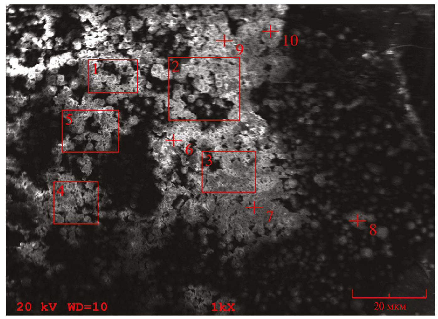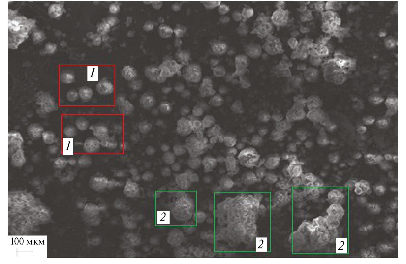 Порошок ZnS–Mn состоит из глобул, которые образуют округлые октаэдрические агрегаты размером 10–100 мкм, например выделенные области 1 и 2 (рис. 4). Агрегаты, в свою очередь, объединены в более крупные вытянутые агломераты, например выделенные области 2 (рис. 4). Поверхность глобул, как и на рис. 3, покрыта слоем слабоструктурированного вещества. Вид частиц (рис. 3, 4) позволяет предположить образование политипных кристаллов, включающих элементы кубической и гексагональной структурных форм сульфида цинка.