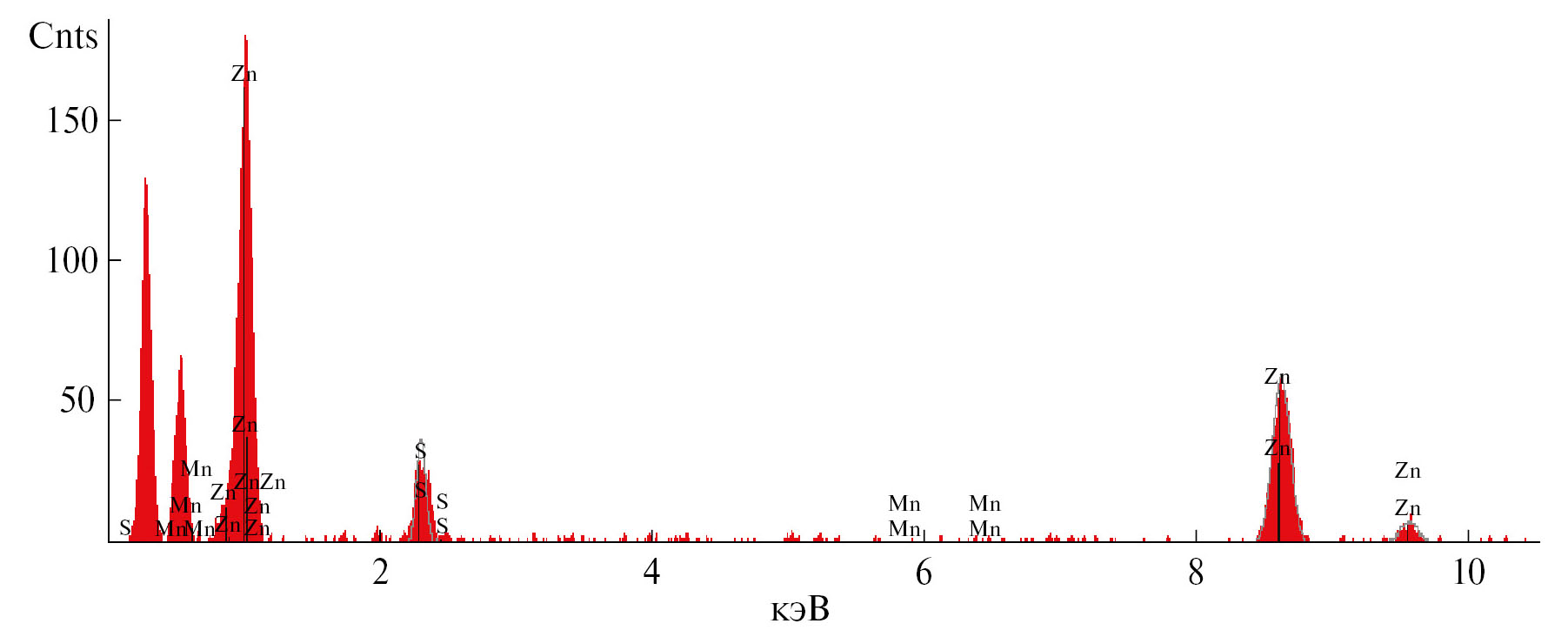 Результаты электронно-зондового микроанализа образцов ZnS и ZnS–Mn приведены на рис. 5–8. На электронных фотографиях (рис. 5, 7) выделены области (прямоугольники) и точки (крестики) измерений, размер которых составляет ~1 мкм. Типичные энергодисперсионные спектры образцов ZnS и ZnS–Mn приведены на рис. 6 и 8. Результаты электронно-зондового анализа подтверждают элементный состав продуктов синтеза, а также их распределение на поверхности частиц ZnS. Уширение сигналов в спектрах может быть связано со структурной неоднородностью вещества, что, в свою очередь, косвенно подтверждает ранее высказанное предположение о политипной структуре формирующихся кристаллов.