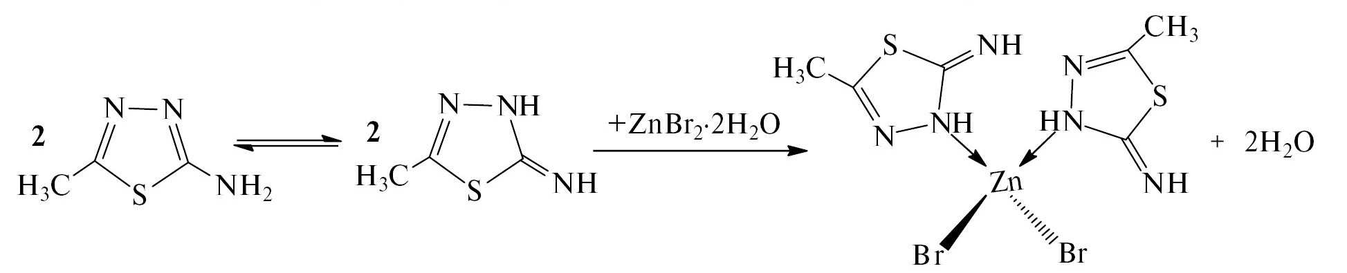 В данной работе синтезированы комплексы галогенидов цинка(II) (I–IV) и нитрата цинка(II) (V–VI) с лигандами L1 (2-аминотиадиазол-1,3,4) и L2 (2-амино-5-метилтиадиазол-1,3,4) и определено их строение. Указанные комплексы получены по реакции (схема 1).