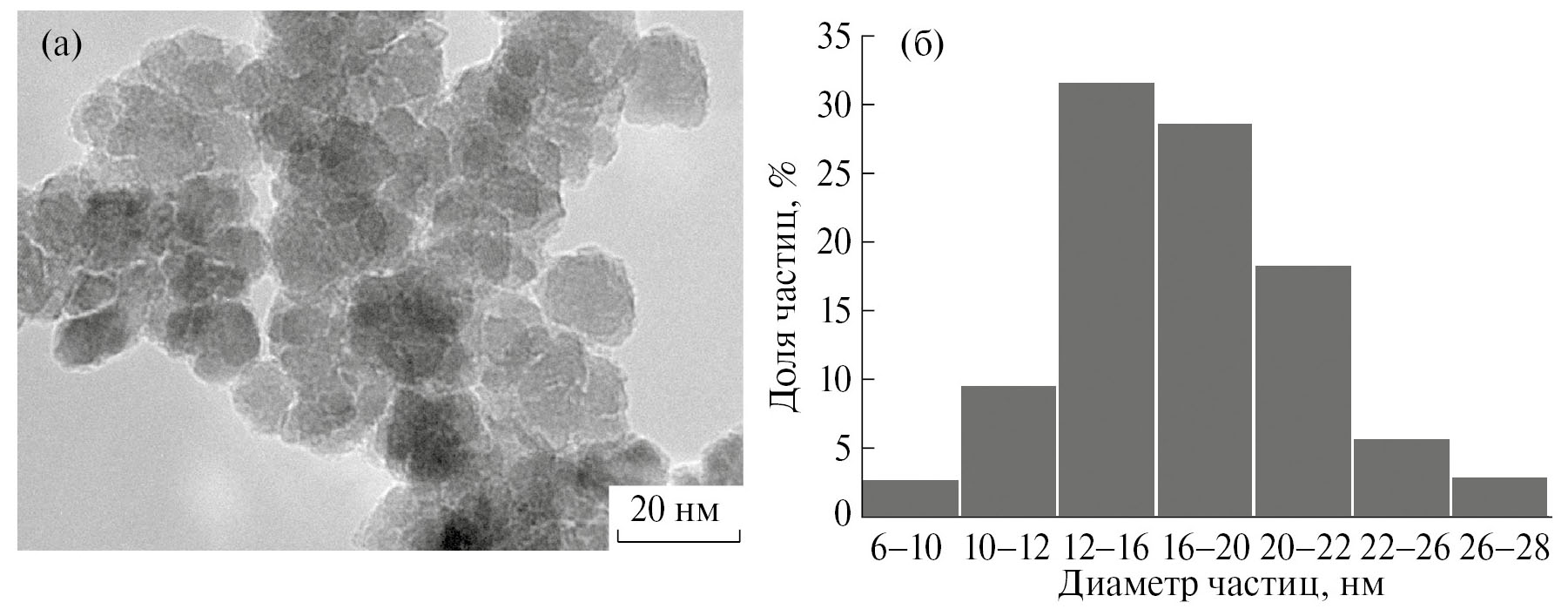 Необходимо учитывать, что при определении размера частиц по рентгенографическим данным возможны погрешности, связанные как с используемым оборудованием (инструментальное уширение пиков, точность юстировки), так и со свойствами самого материала, например, дефекты кристаллической решетки тоже приводят к уширению рентгеновских пиков. Поэтому образцы были исследованы методом просвечивающей электронной микроскопии (рис. 5а). Полученные данные хорошо согласуются с результатами РФА, средний размер частиц составил 15.9 ± 1.1 нм. Распределение частиц по размерам, рассчитанное по 467 частицам, представлено на рис. 5б.