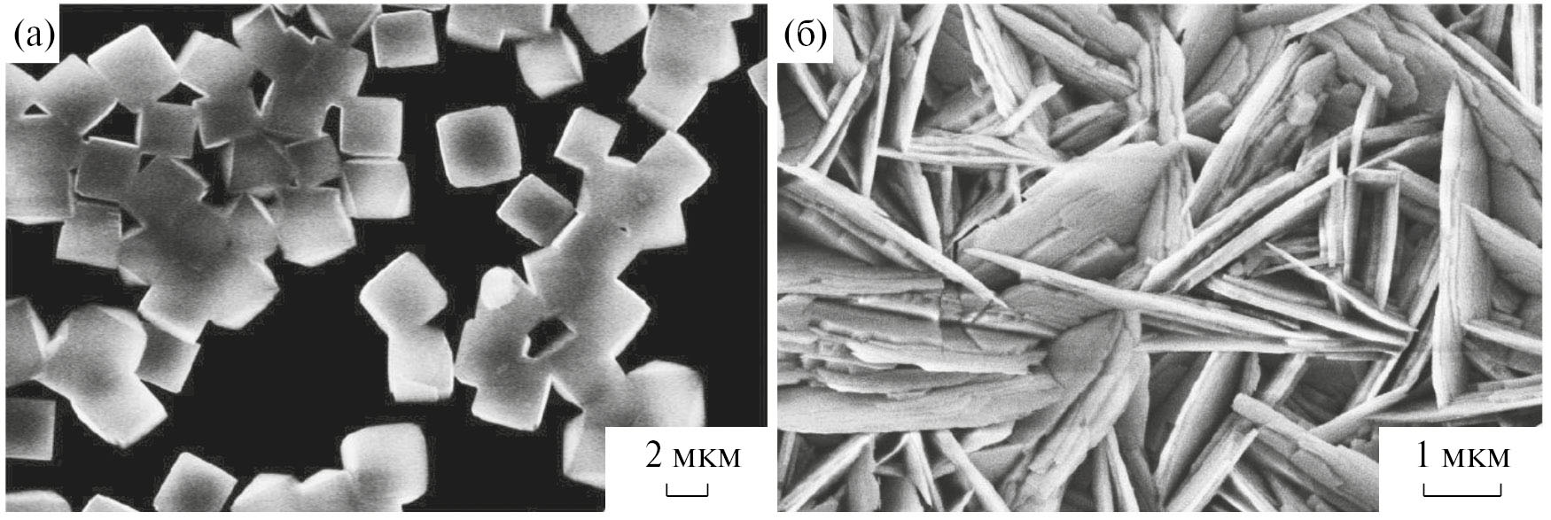 Рис. 1. СЭМ-изображения кристаллов, синтезированных на поверхности 0.02 М водных растворов Ca(CH3COO)2 (а) и Sr(CH3COO)2 (б) в результате их обработки газообразным HF. а, б строчные; µm заменить на мкм