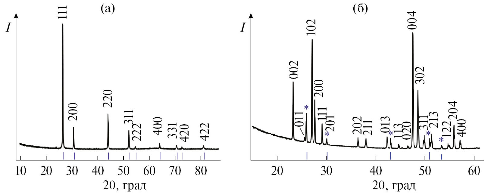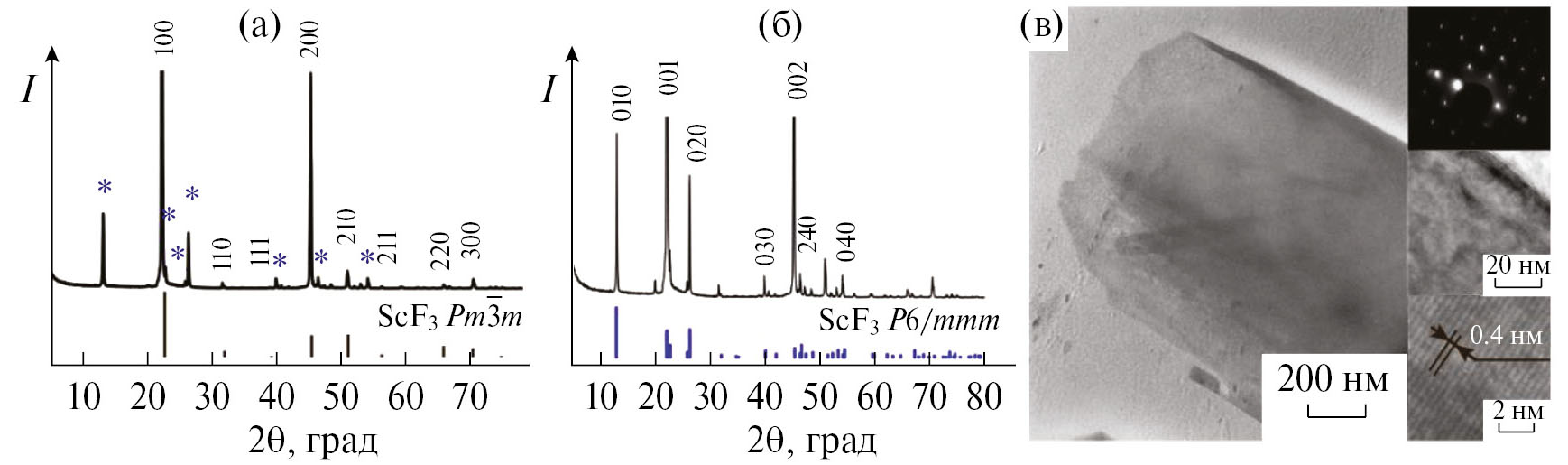 В работе [52] приведены результаты исследования состава синтезированных в процессе реакции на границе раздела кристаллов фторида скандия методами РФЭС, ИК-Фурье-спектроскопии пропускания, ЭДС-микроанализа. Исследования показали, что состав синтезированных кристаллов отвечает стехиометрическому соотношению элементов в ScF3. Типичная рентгенограмма пленки ScF3, состоящей из кубических и стержнеобразных кристаллов, приведена на рис. 5а. Высокоинтенсивные пики при углах Брэгга 2è = 22.1° и 45.2° и другие менее интенсивные с отмеченными (hkl) направлениями относятся к кристаллическим плоскостям ScF3 с кубической кристаллической решеткой и пр. гр. Pm3m (карта ICDD № 00-046-1243 [53]). Относительная интенсивность максимумов подтверждает сильную текстуру образца, а именно факт преимущественной ориентации кубических кристаллов [100]. Дополнительные серии дифракционных пиков, отмеченные на рис. 5а звездочками синего цвета, отнесены к кристаллическим плоскостям некубической полиморфной модификации фторида скандия. На рис. 5б представлена рентгенограмма образца с морфологией стержнеобразных кристаллов. Согласно результатам количественного анализа, выполненного в Topas 5.0 по методу Ритвельда, содержание кубической фазы в составе образца не превышает 4%. В работе [54] впервые решена кристаллическая структура гексагональной фазы ScF3 в пр. гр. P6/mmm с параметрами решетки a = 7.81626, c = = 4.01144 Å и показано, что призматические кристаллы демонстрируют сильное термическое сжатие, анизотропное при температурах 20–400°С.
