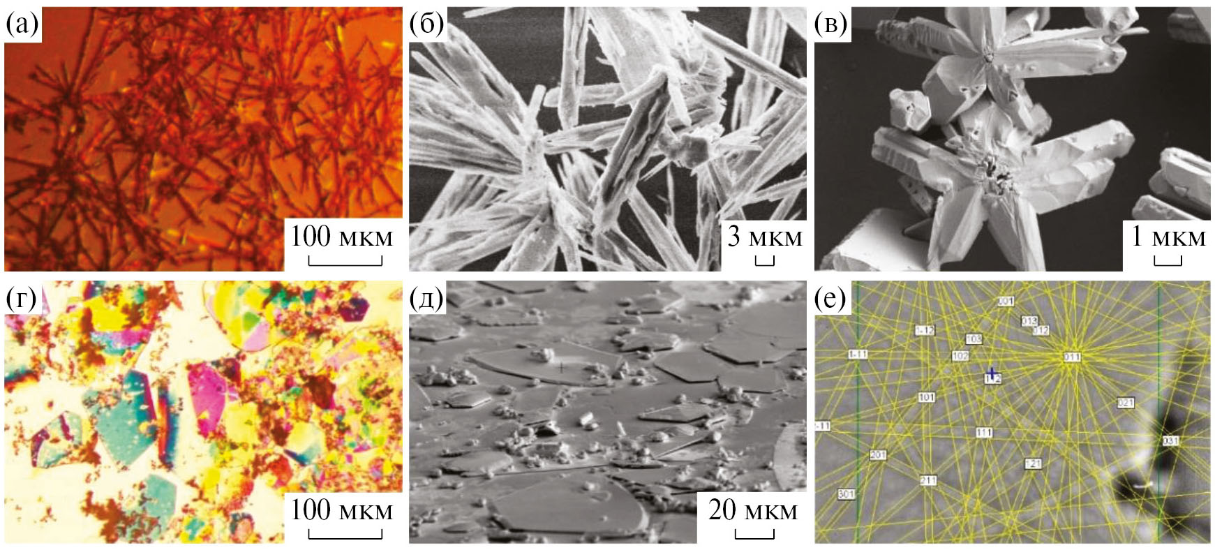 Рис. 3. Оптические (а, г) и СЭМ-изображения (б, в, д) кристаллов PbF2, синтезированных на поверхности растворов Pb(CH3COO)2 (а–в) и Pb(CH3COO)2/KCH3COO (г, д) при действии газообразного HF; е — картина Кикучи двумерного кристалла PbF2 с указанием индексации атомных плоскостей.