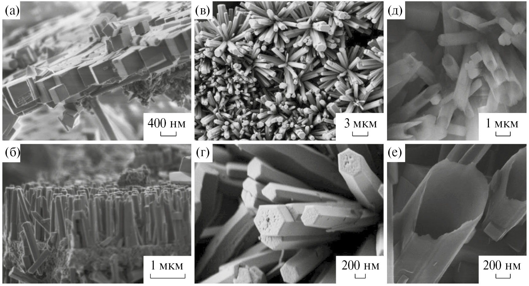 Рис. 4. СЭМ-изображения при различном увеличении кристаллов, синтезированных на поверхности 0.1 М (а, б) и 0.05 М (в, г) водных растворов ScCl3; 0.02 М Sc(NO3)3 (д) в результате взаимодействия с газообразным HF; е — изображение трубки ScF3, полученное методом HeИМ. а–е строчные; µm заменить на мкм; нм