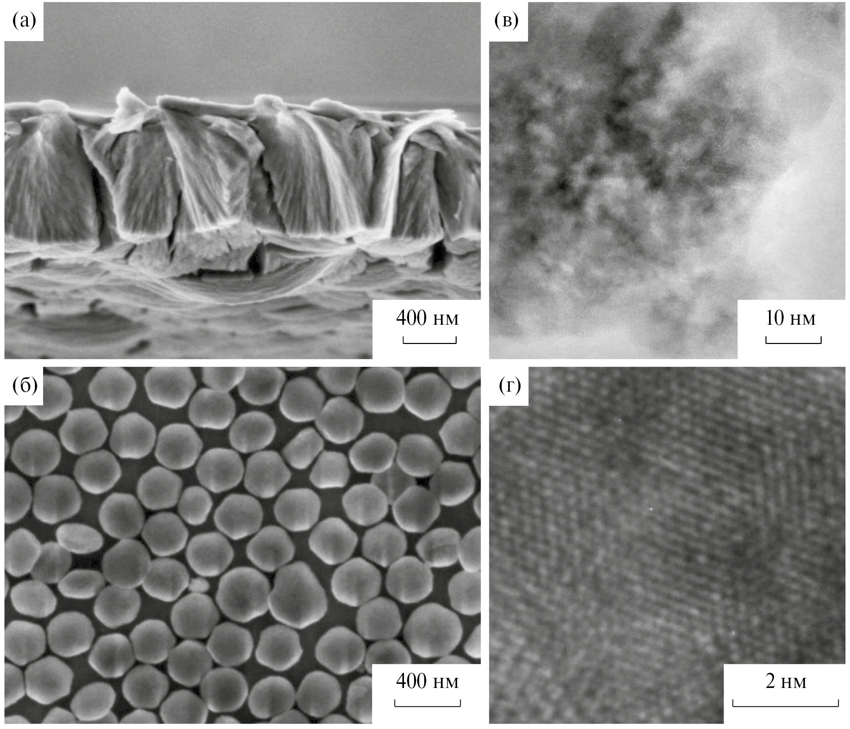 Если использовать в качестве жидкофазного реагента 0.035 М раствор La(NO3)3 в 1 M HNO3, формирующаяся пленка представляет собой совокупность частиц, лежащих горизонтально на границе раздела [60]. СЭМ-изображение таких частиц после переноса пленки на поверхность кремниевой подложки и высушивания при температуре 150°С приведено на рис. 6б. Можно отметить, что в этом случае диаметральный размер частиц не превышает 300 нм, а их толщина составляет ~50 нм. Большинство частиц имеет округлую форму, однако у некоторых можно отметить углы 120°, характерные для кристаллов с пр. гр. P3c1. На основании изображений ПЭМ ВР (рис. 6в, 6г) можно сделать вывод, что частицы неоднородны по толщине, но обладают кристаллической решеткой с межплоскостными расстояниями, характерными для тисонита с Z = 6 [61].